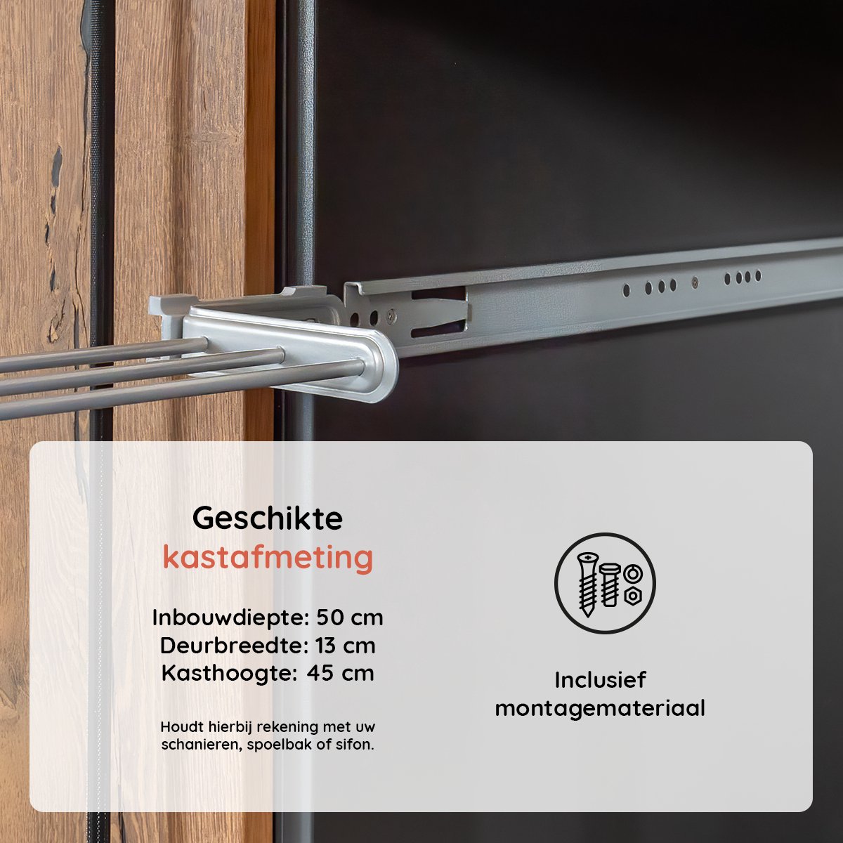 Let op! Dit handdoekrek is 31cm lang en nog eens 8cm uittrekbaar uit uw keuken- of badkamerkast. De geschikte kastafmeting om deze handdoekhouder in te bouwen bedraagt deurbreedte van: 13 cm, inbouwdiepte van 50 cm en een kasthoogte van 4,5 cm. Houdt hierbij rekening met uw spelbak of sifon.