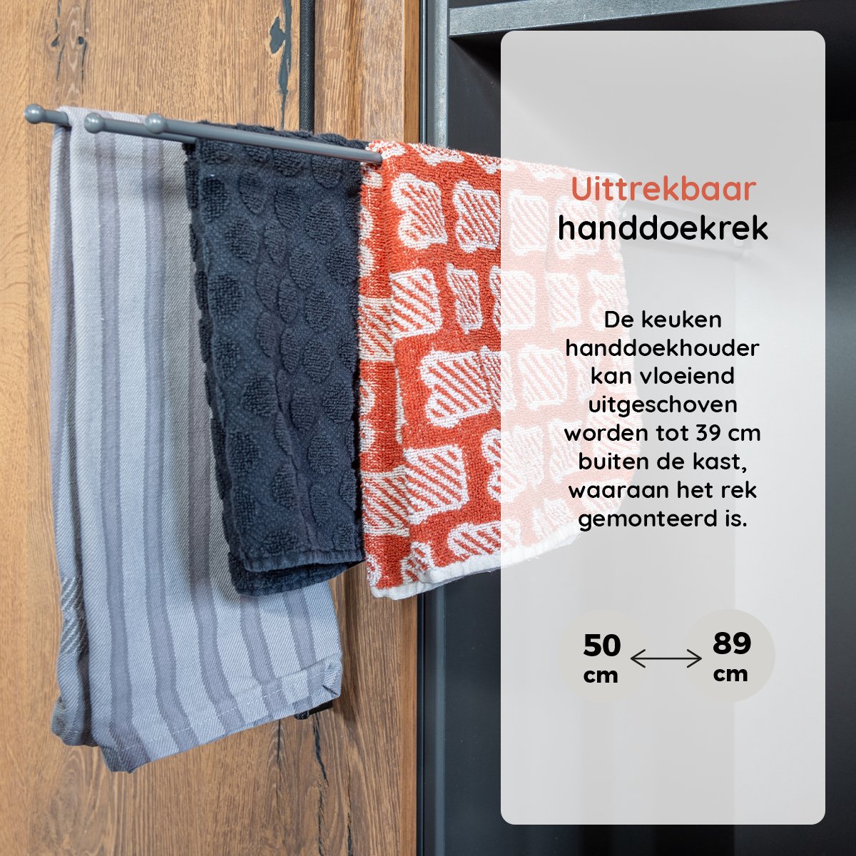 De Eleganca handdoekhouder is uittrekbaar tot 89 cm. Zo kan de keuken handdoekhouder vloeiend uitgeschoven worden buiten de kast. Dit moderne en stevige handdoekrek maakt uw keuken of badkamer compleet.