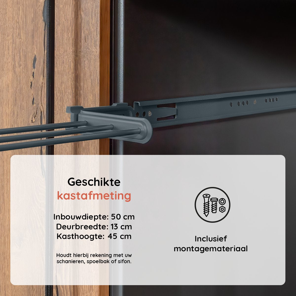 Let op!: Dit handdoekrek is 50cm lang en nog eens uittrekbaar uit uw keuken- of badkamerkast. De geschikte kastafmeting om deze handdoekhouder in te bouwen bedraagt deurbreedte van: 13 cm, inbouwdiepte van 50 cm en een kasthoogte van 45 cm. Meet dus vooraf u kastjes goed op, om onnodige retours te voorkomen. Houdt hierbij rekening met uw spoelbak of sifon.