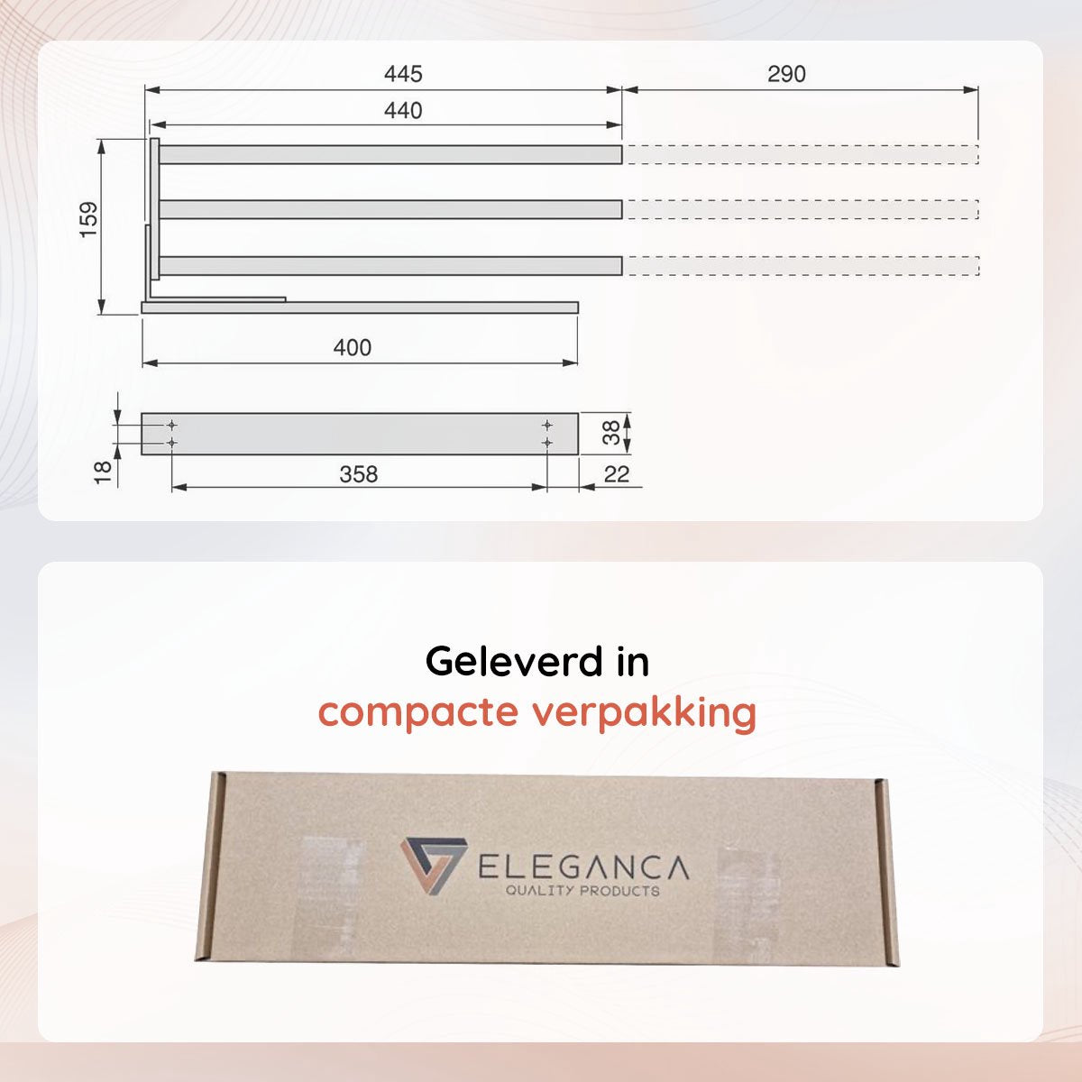 Dit uittrekbare, luxe handdoekrek van Eleganca is een must-have om jouw badkamer en/of keuken stijlvol en geordend in te richten. Dit Eleganca uittrekbaar Handdoekrek is eenvoudig te monteren, vriendelijk in gebruik en gemaakt van hoge kwaliteit aluminium. Door het moderne en stevige design van deze handdoekstang en het formaat van D44,5 x B15,9 x H3,8cm, past deze luxe handdoekhouder mooi in elke keuken of badkamer. Het badkamer handdoekrek kan eenvoudig onder- of aan de zijkant van een kast gemonteerd worden. De keuken handdoekhouder kan vloeiend uitgeschoven worden tot 29cm buiten de kast, waaraan het rek gemonteerd is.