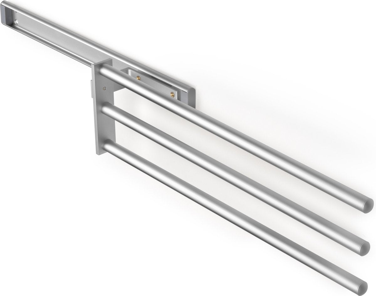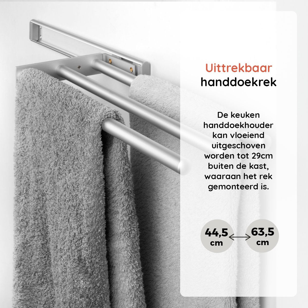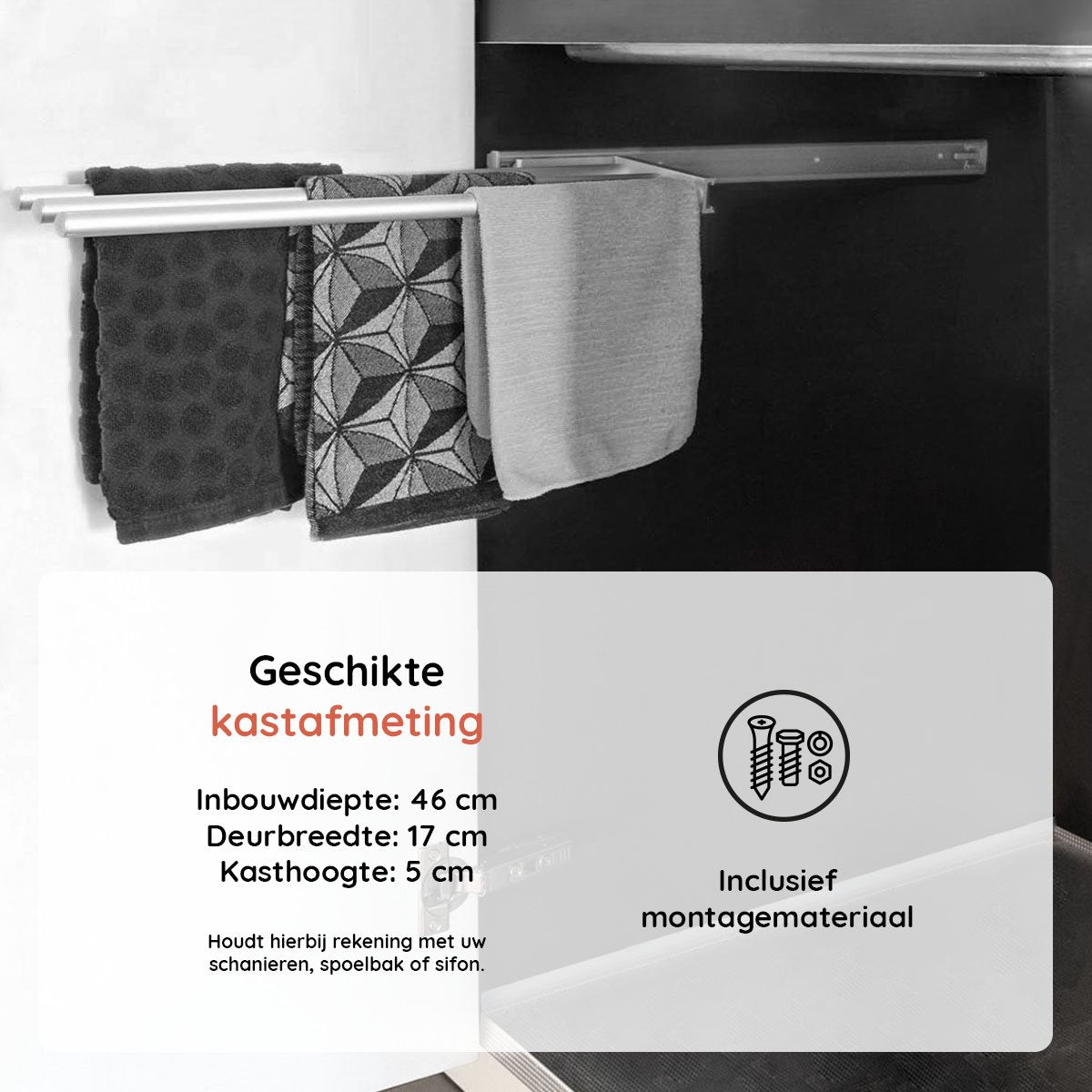 Eleganca Uittrekbaar Handdoekrek – Inbouwafmeting B17 x D46 x H5cm – Handdoekhouder uitschuifbaar tot 29cm – Handdoekstang keuken of badkamer – Horizontaal en verticaal te gebruiken – 3 armen – Aluminium – Zilver