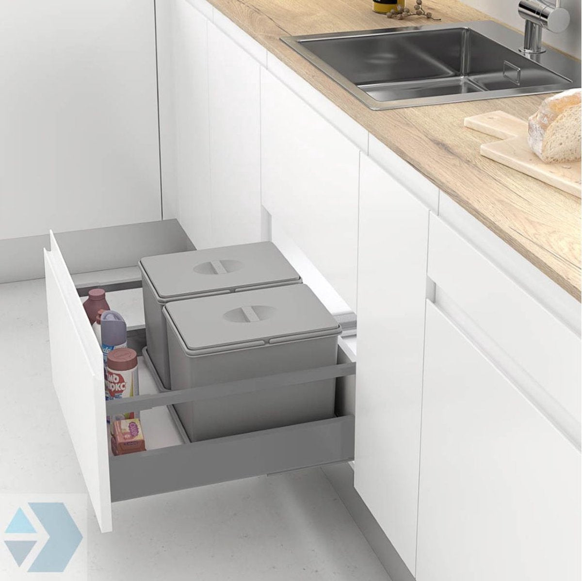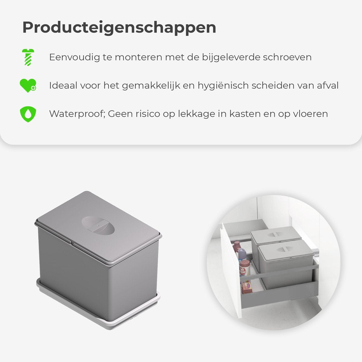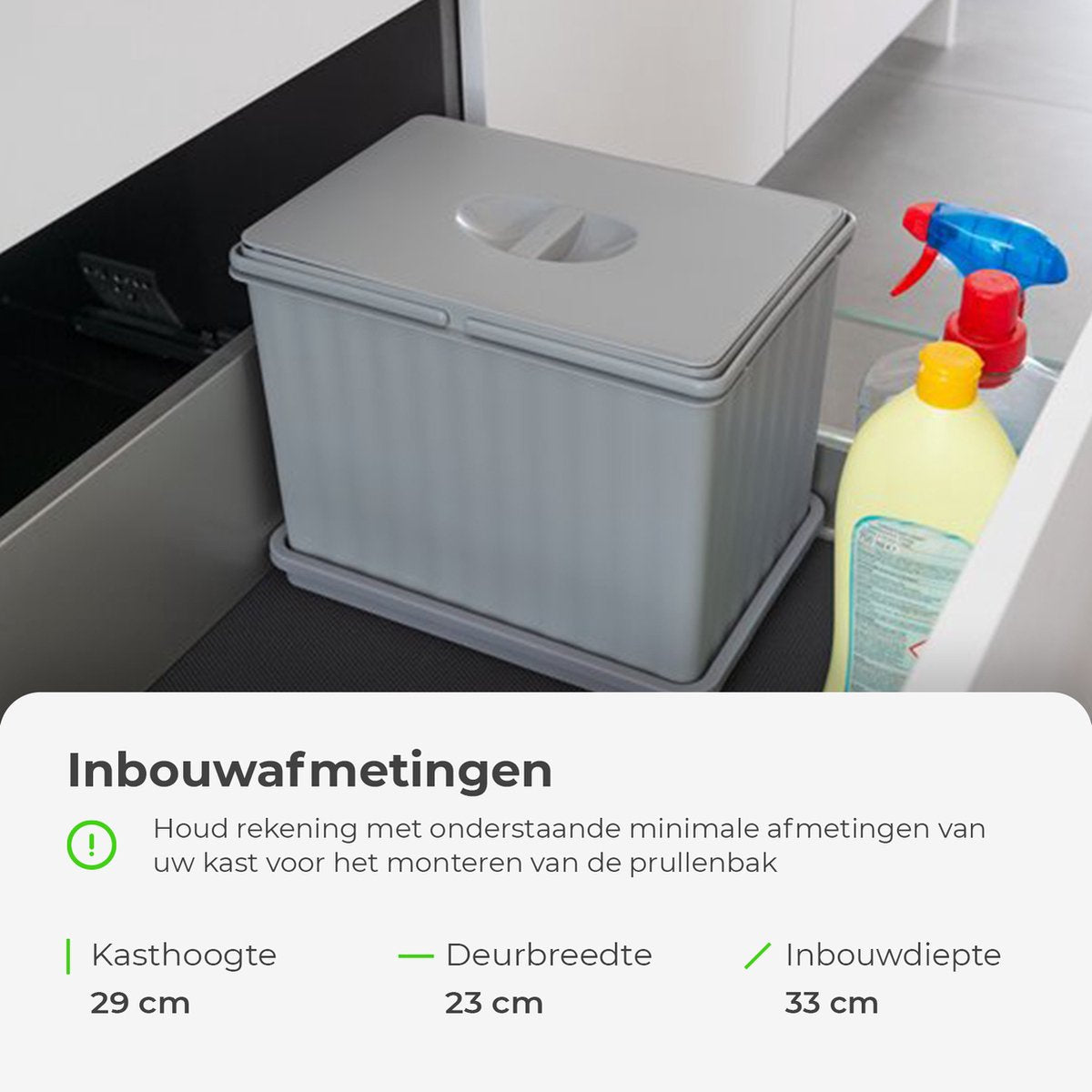 Let op: deze prullenbak past perfect in keukenkastjes met een minimale deurbreedte van 23 cm, minimale diepte van 33 cm en een minimale kasthoogte van 29 cm.