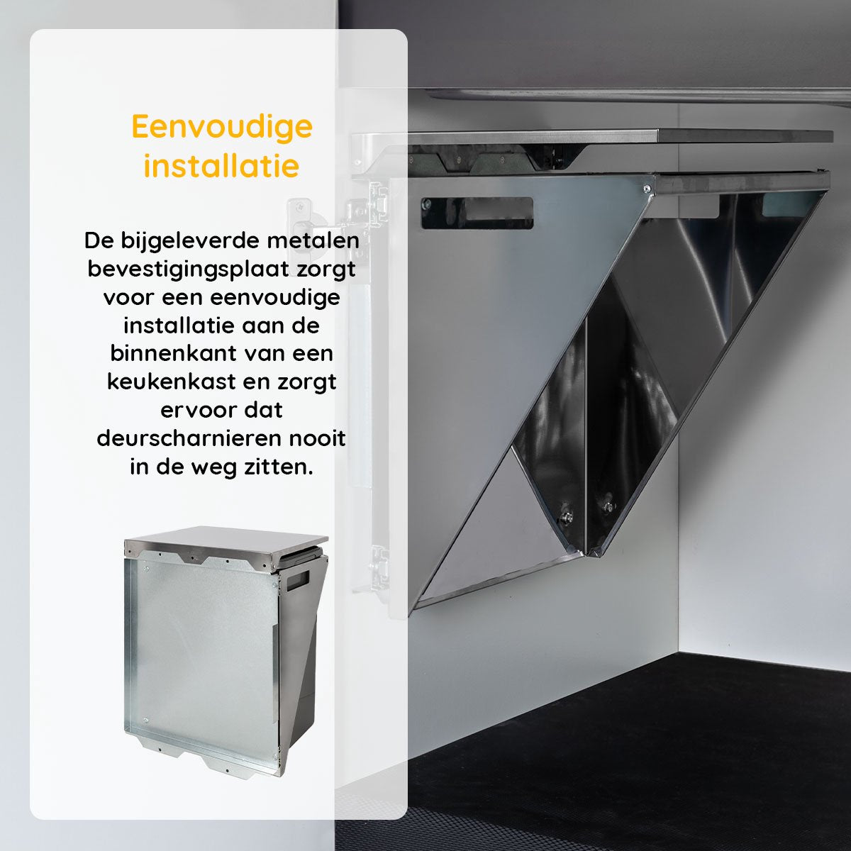 Dankzij de innovatieve bevestigingsplaat worden problemen met deurscharnieren vermeden. Deze plaat zorgt ervoor dat de afvalbak moeiteloos uittrekbaar is, zonder dat de scharnieren de beweging hinderen, wat de gebruiksvriendelijkheid ten goede komt.