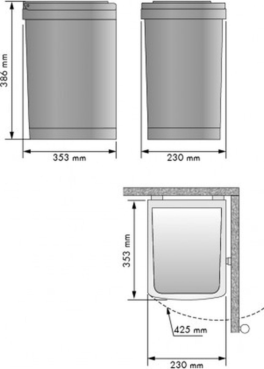 LET OP: de prullenbak past perfect in keukenkastjes met een minimale deurbreedte van 42.5 cm, minimale inbouwdiepte van 23 cm en een minimale kasthoogte van 39 cm. Diagonaal is de afvalbak 40cm dit is de minimaal benodigde ruimte om de afvalbak te laten draaien.