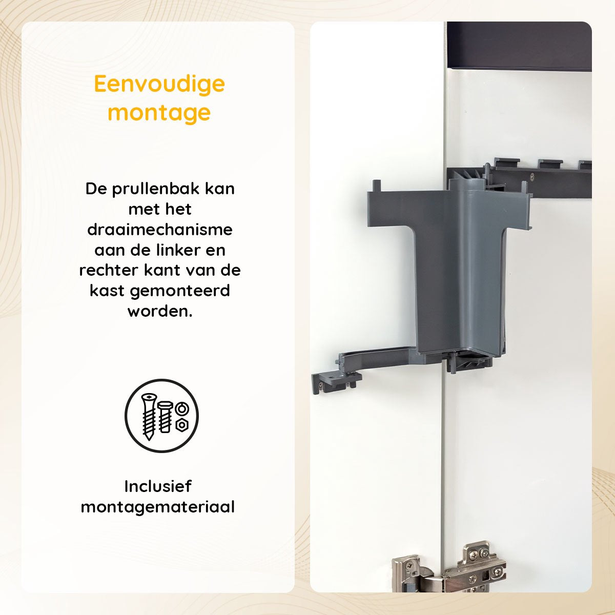 De Eleganca prullenbak is uitdraaibaar, waardoor het makkelijk in keukenkastjes past en niet meer ruimte dan nodig in beslag neemt. Het draaimechanisme kan zowel aan de linker- als rechterkant van de binnenkant van het kastje gemonteerd worden. Monteren gaat makkelijk en snel met de bijgeleverde bevestigingsschroeven. De uitneembare emmer binnenin heeft een inhoud van 24 liter, en dimensies: B 34,1cm X D 26cm X H 46,6cm. Deze prullenbak wordt geleverd met 3x50 bijpassende witte vuilniszakken.