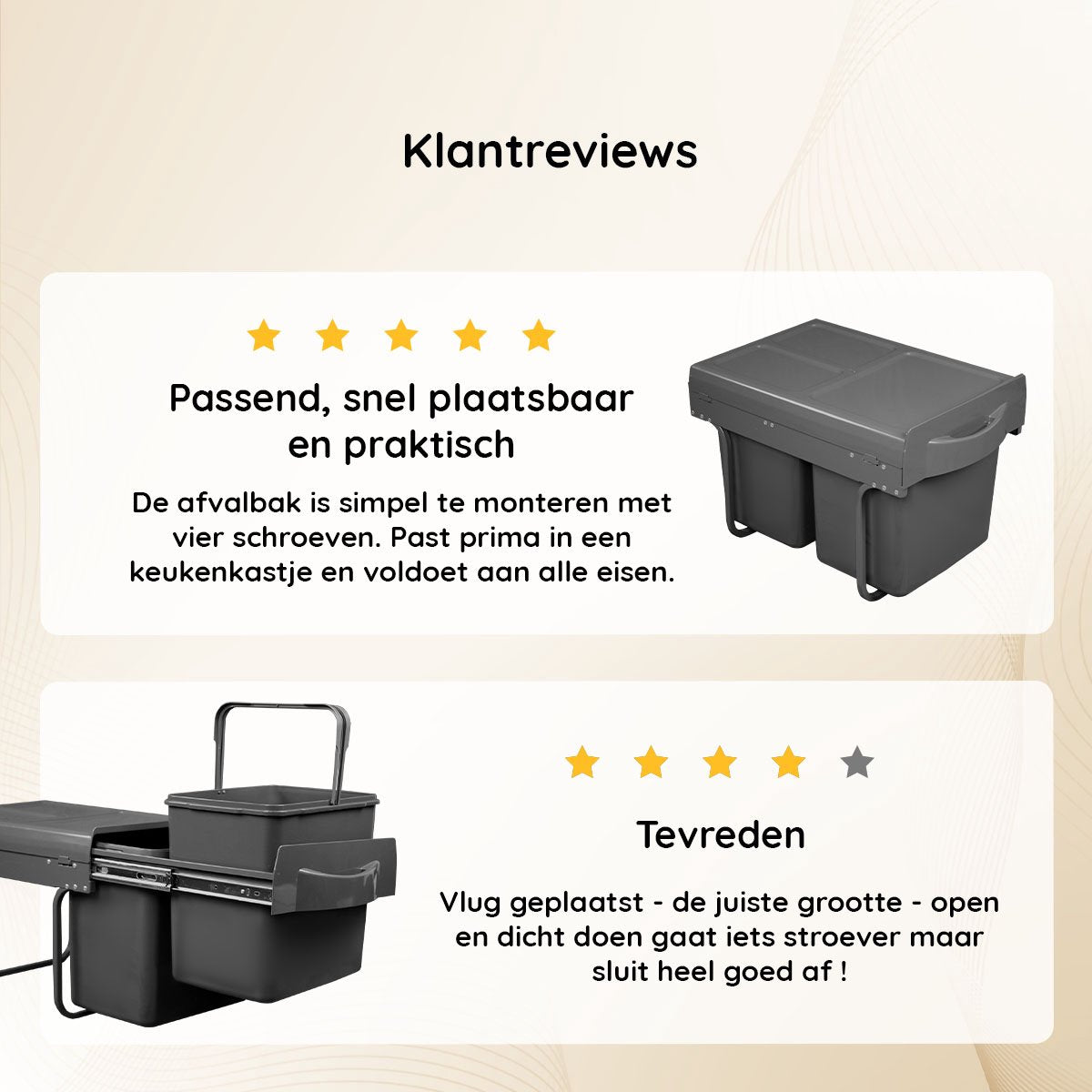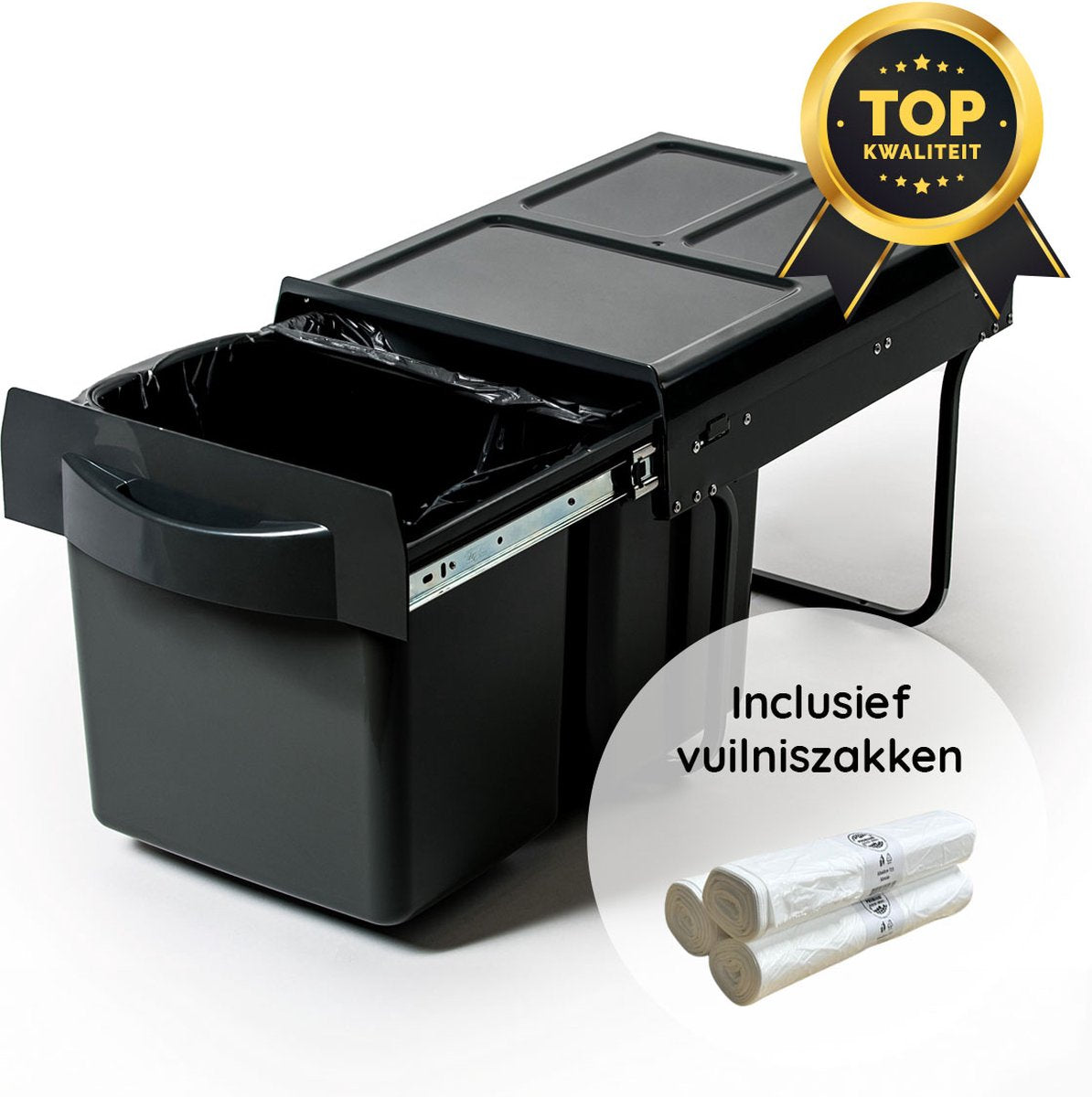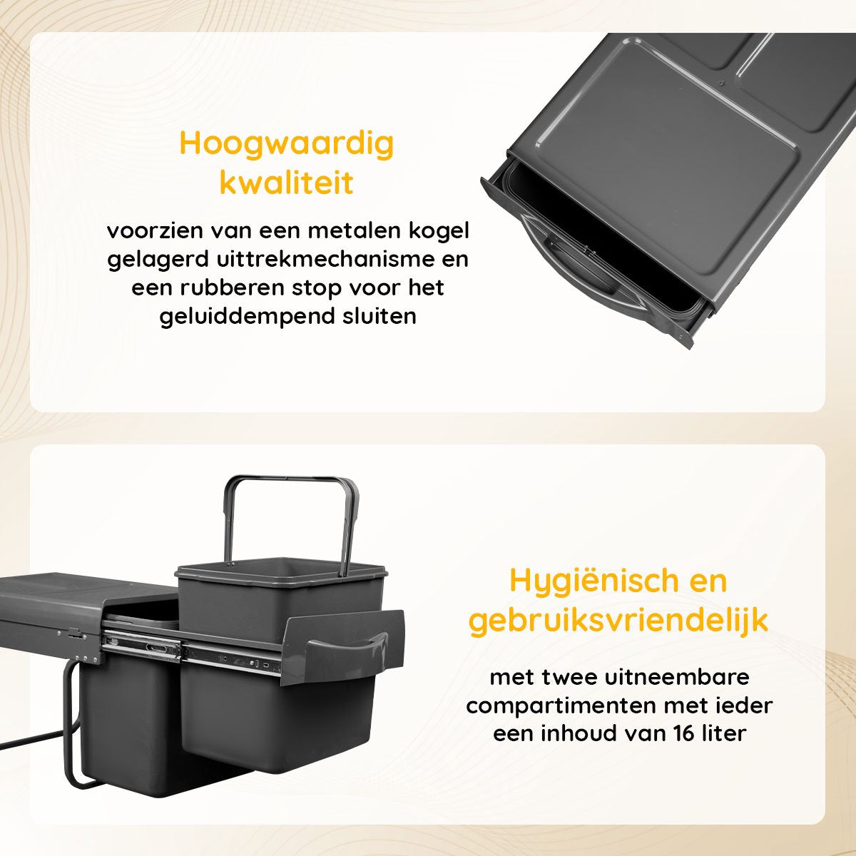 Eleganca Uittrekbare Afvalbak 2x16 Liter – Inbouw Afvalemmer voor afvalscheiding – Geschikt voor deurbreedte vanaf 40 cm en inbouwdiepte vanaf 52 cm – Antraciet