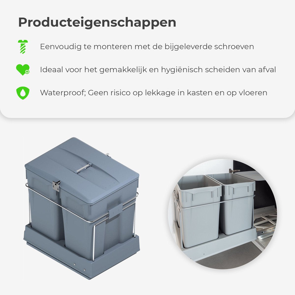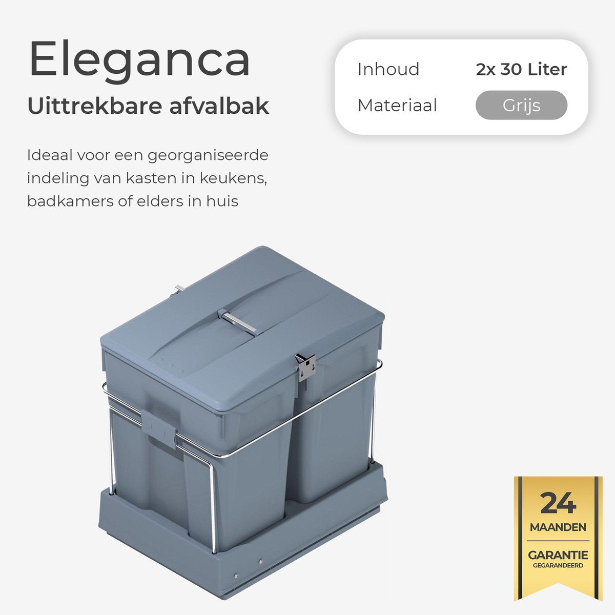 Eleganca Uittrekbare Afvalbak 2x30 Liter – Inbouw Prullenbak - Afvalbak afvalscheiding – Geschikt vanaf deurbreedte 40 cm, inbouwdiepte 51 cm & Kasthoogte 53 cm – Grijs