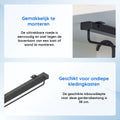Door het elegante design van deze kledingroede en het compacte formaat van 37x6.8x6.4cm past deze garderobestang mooi in elke kledingkast. De kledingstang is 65% uitschuifbaar d.m.v. kogellagers en is extra zwaar belastbaar tot 15KG. Deze kastroede is uiterst geschikt voor het achter elkaar hangen van kleding in bijvoorbeeld ondiepe kledingkasten.