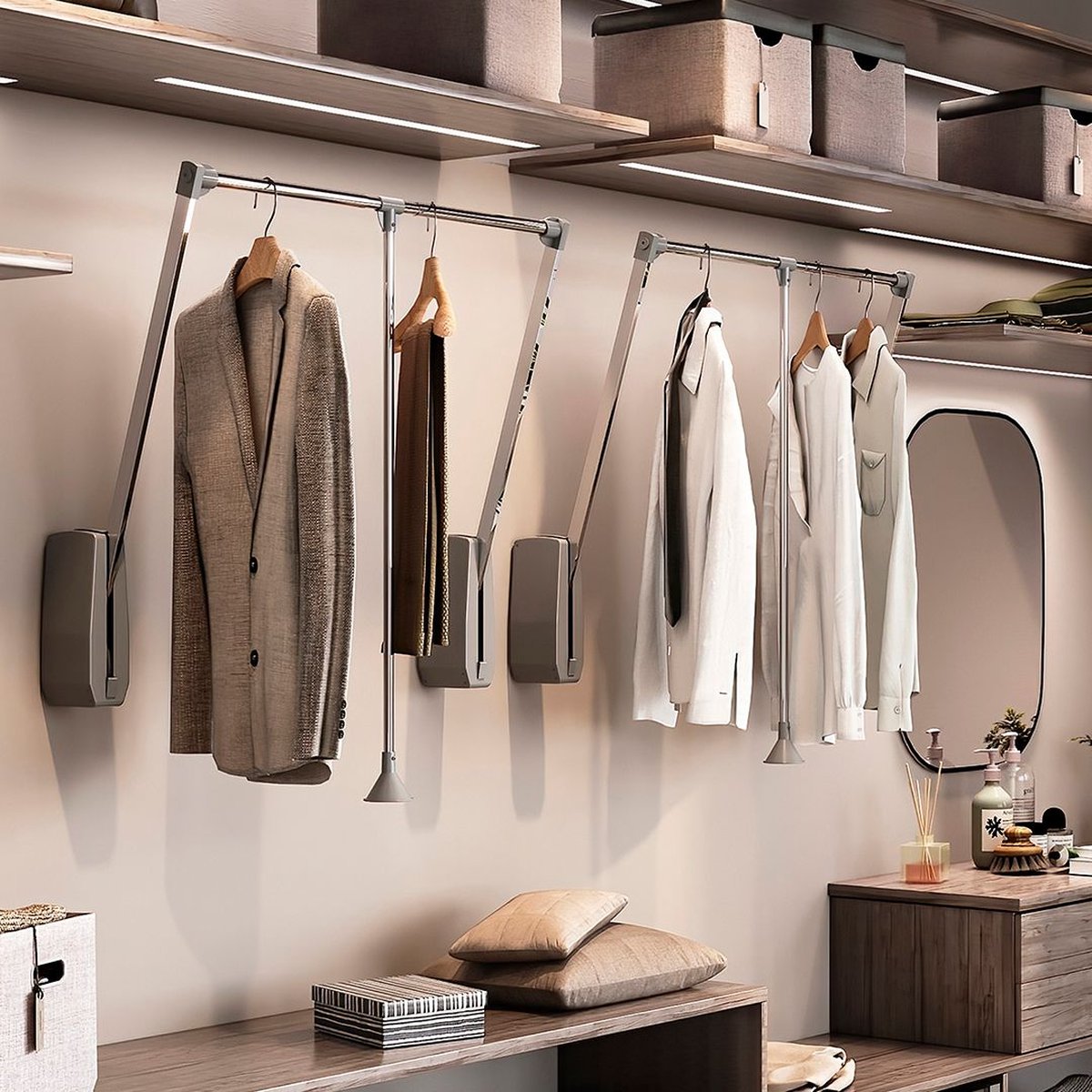 De kledinglift is passend door zijn elegante en mooie design in elke kledingkast. De kledinglift is hiernaast door het compacte design gemakkelijk in grote en kleine kledingkasten te monteren. Het formaat van de kleding lift is ook aan te passen door de breedte groter en kleiner te verstellen.