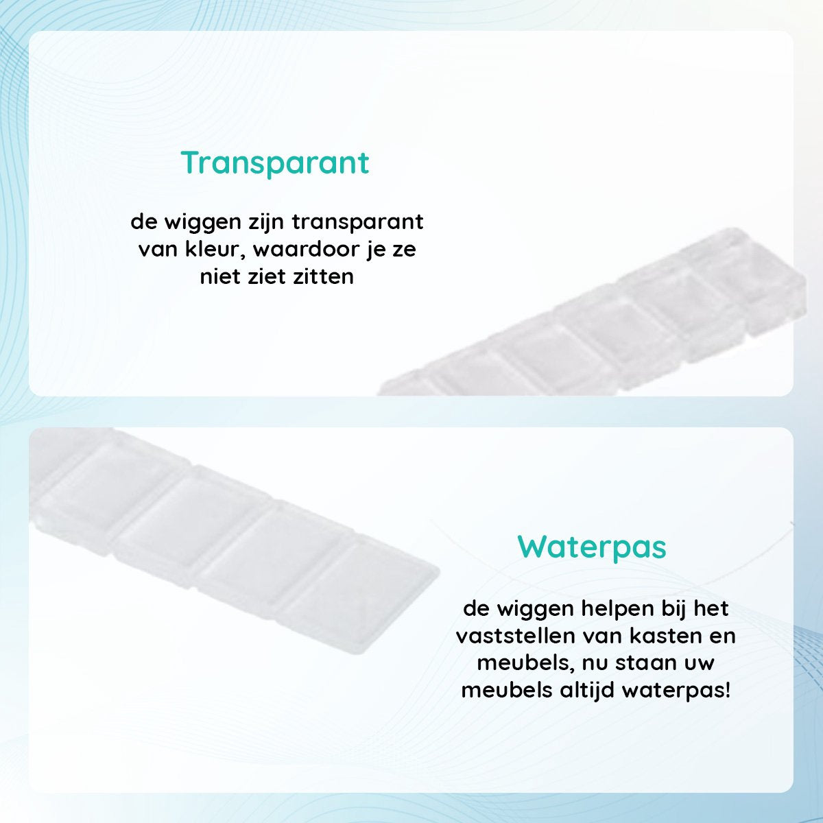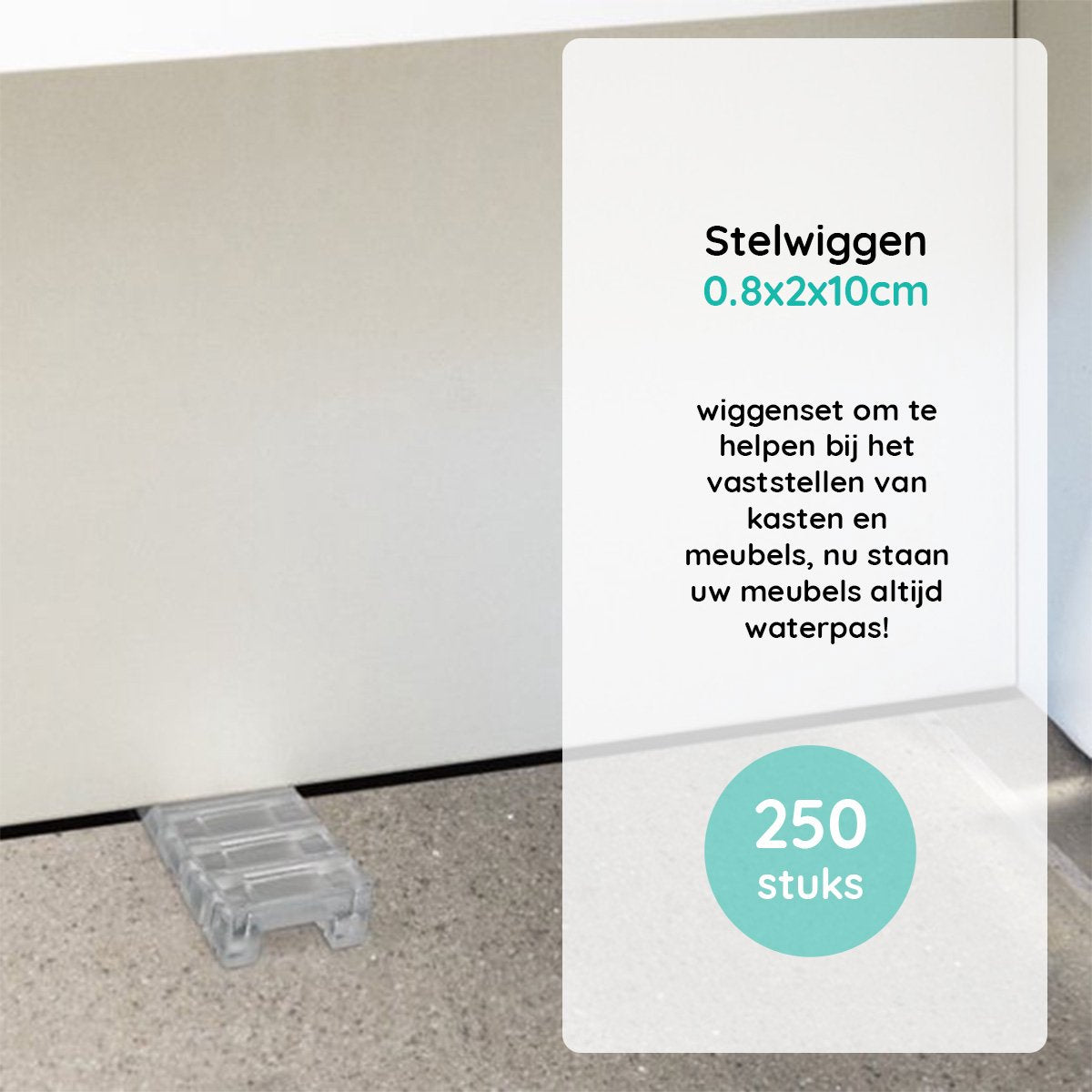 Deze Eleganca wiggen - transparant - 250st. - stelwiggen - wiggenset - 0.8x2x10cm zijn onmisbare hulpmiddelen bij het stellen van kasten en meubels. De stelwiggen werken eenvoudig en gebruiksvriendelijk. Stel het gewenste meubel of kast waterpas, plaats de meubelwig zover mogelijk onder de meubel en breek naar wens het uitstekende gedeelte of op één van 7 breekpunten. De afmetingen van de handige breekwiggen zijn 0.8x2x10cm.