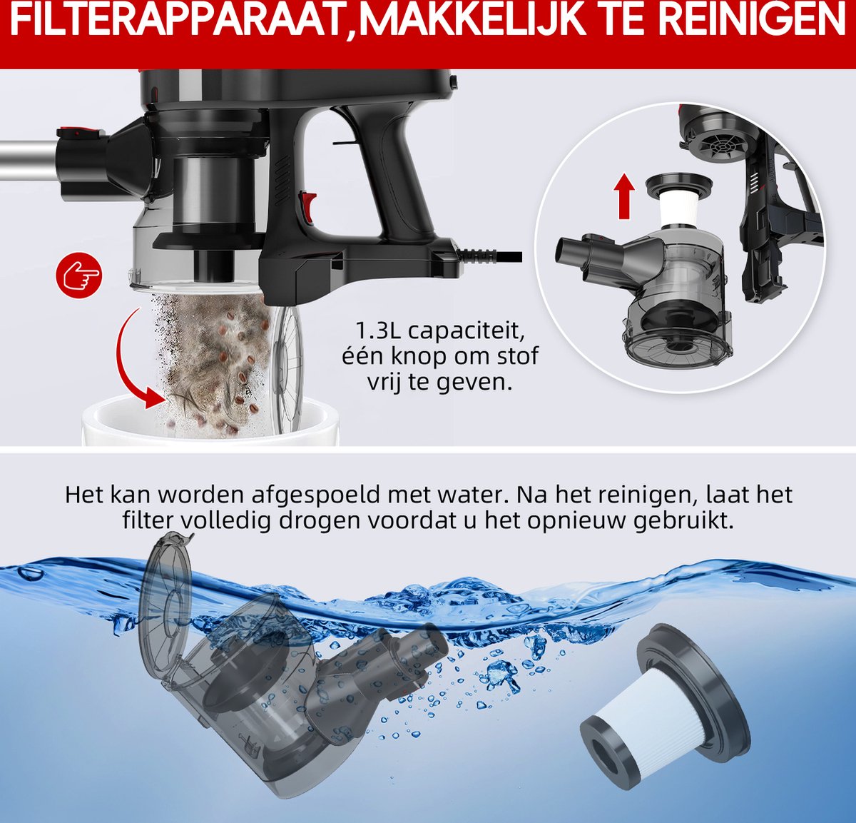 Met een grote stofbak van 1,3 liter kunt u langdurig schoonmaken zonder vaak te hoeven legen. Met één druk op de knop wordt het legen van vuil eenvoudig gemaakt, waardoor uw handen schoon blijven. Het voldoet moeiteloos aan alle schoonmaakbehoeften in huis.
