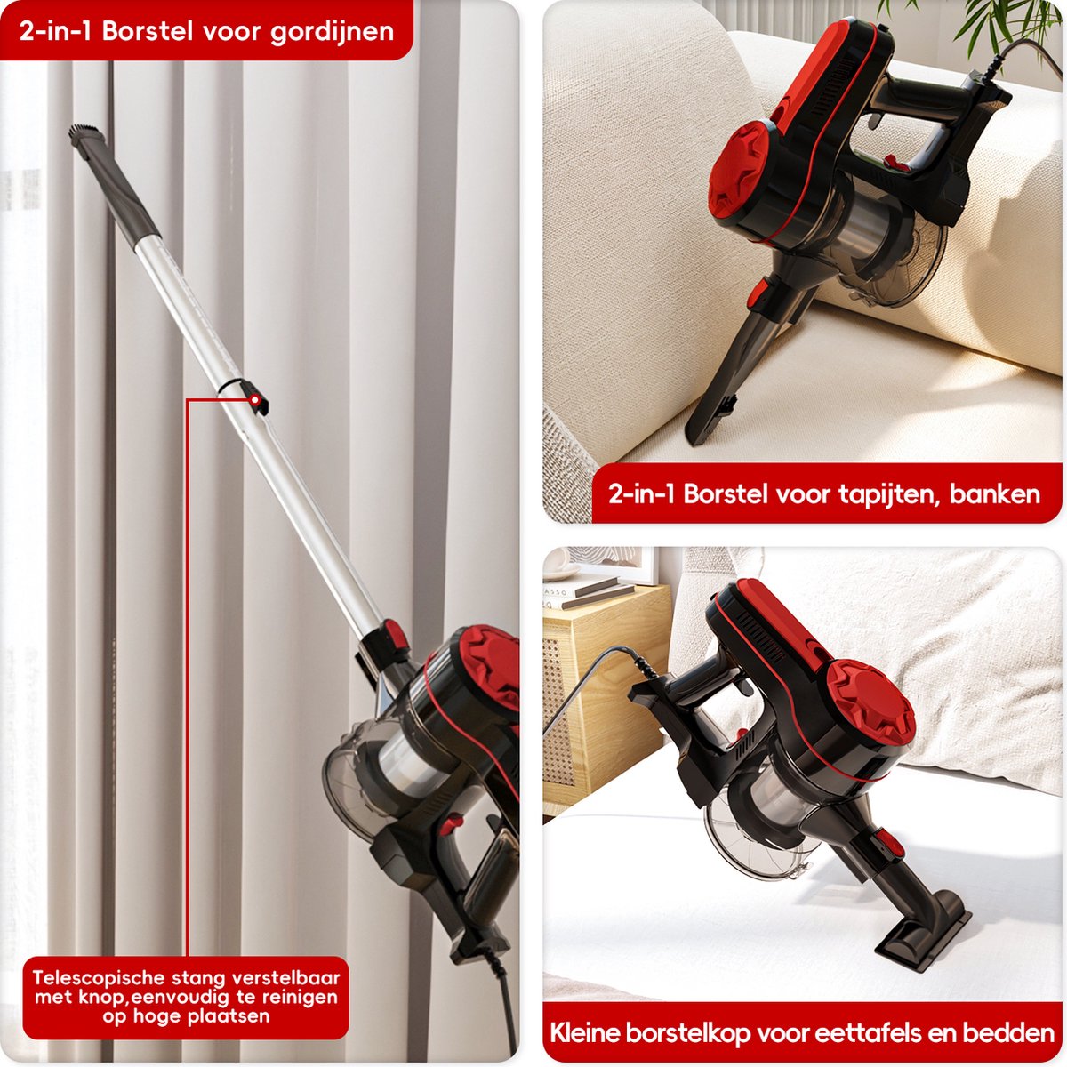 Onze bedrade steelstofzuiger is uitgerust met een in meerdere standen verstelbare telescoopsteel, waardoor u tijdens het schoonmaken meer flexibiliteit en gemak heeft. Of u nu hoeken op grote hoogte schoonmaakt of moeilijk bereikbare gebieden op de vloer behandelt, onze telescoopsteel kan aan uw behoeften voldoen. Druk op de aanpassingsknop om eenvoudig de gewenste lengte in te stellen, zodat u zich gemakkelijk kunt aanpassen aan verschillende hoogtes en hoeken om verschillende schoonmaaktaken uit te voeren.