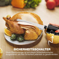 Dankzij de geavanceerde technologie en het ontwerp van de elektrische allessnijder, produceert deze niet alleen minder geluid, maar ook minder trillingen dan andere snijmachines op de markt. Hierdoor ligt het mes beter in de hand en voelt het comfortabeler aan tijdens het gebruik. De veiligheidsschakelaar en de mesontgrendelingsknop zorgen voor extra veiligheid bij elke snijbeurt.