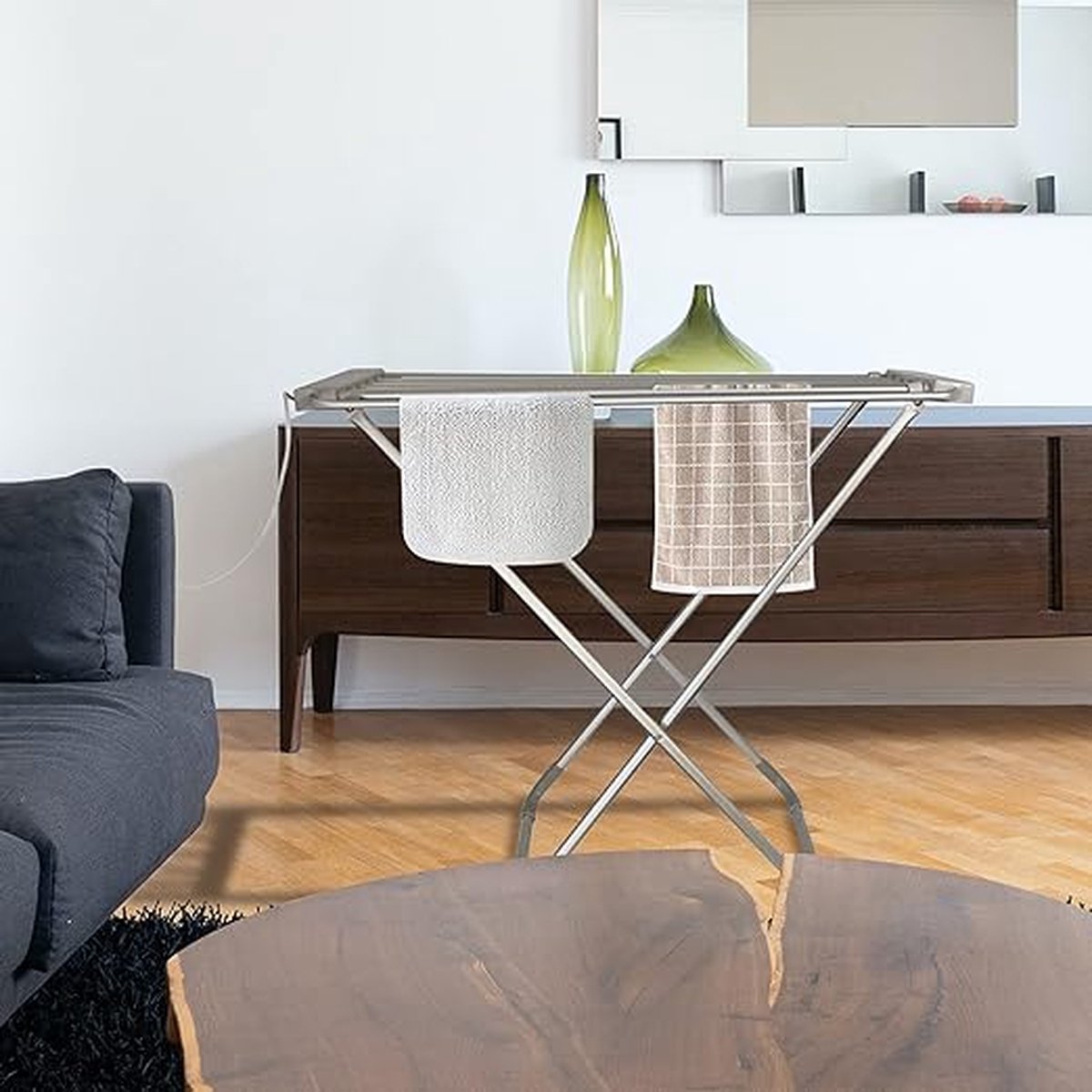 PRAKTISCH: Onze handdoekdroger, vervaardigd uit hoogwaardig aluminium, combineert functionaliteit met gemak. Het rek is opvouwbaar en in slechts 2 seconden op te klappen, waardoor het eenvoudig op te bergen is in beperkte ruimtes. Het lichte gewicht en de mobiliteit maken het een onmisbaar item in uw huishouden.
