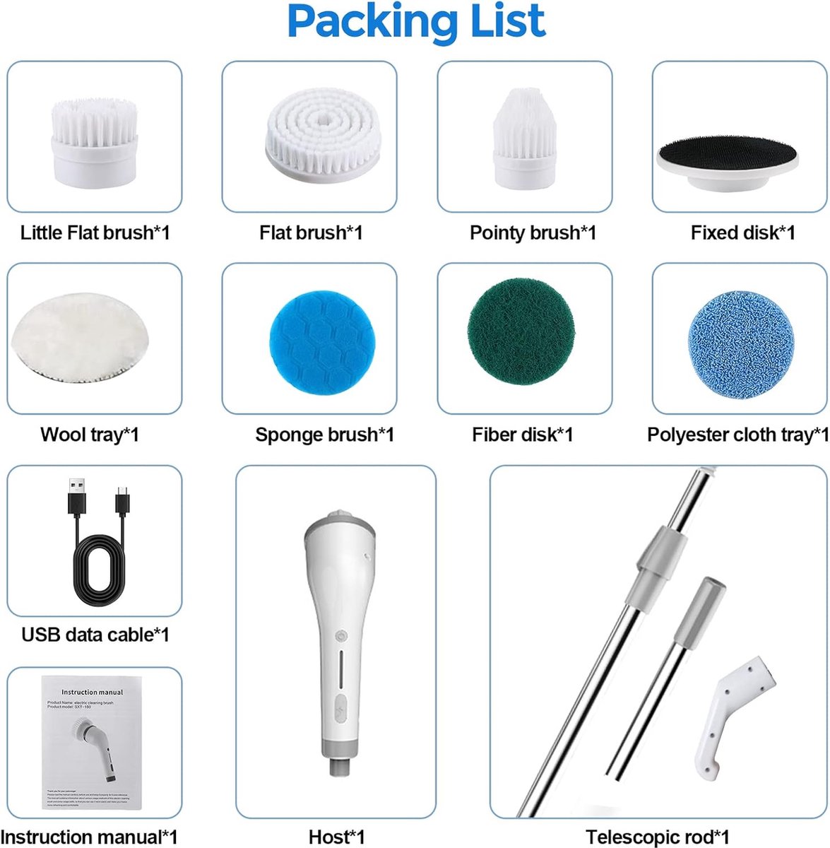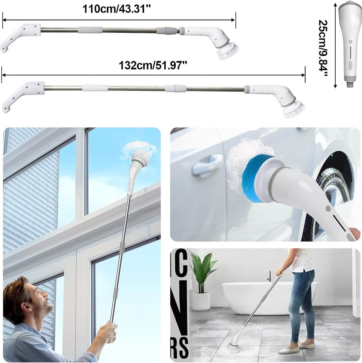 7 Borstelkoppen en Verlengstang: De elektrische spin scrubber bestaat uit drie delen: de hoofdunit, de handgreep en de borstelkop. Daarnaast wordt de set geleverd met een afneembare en uitschuifbare metalen verlengstang en 7 vervangbare borstelkoppen, geschikt voor verschillende schoonmaaksituaties.