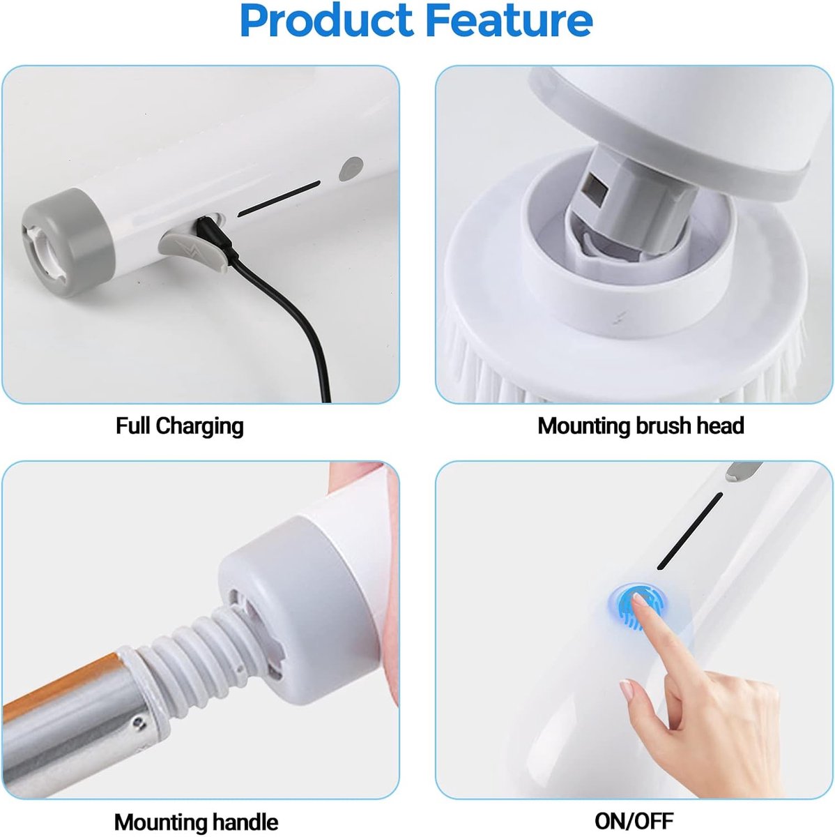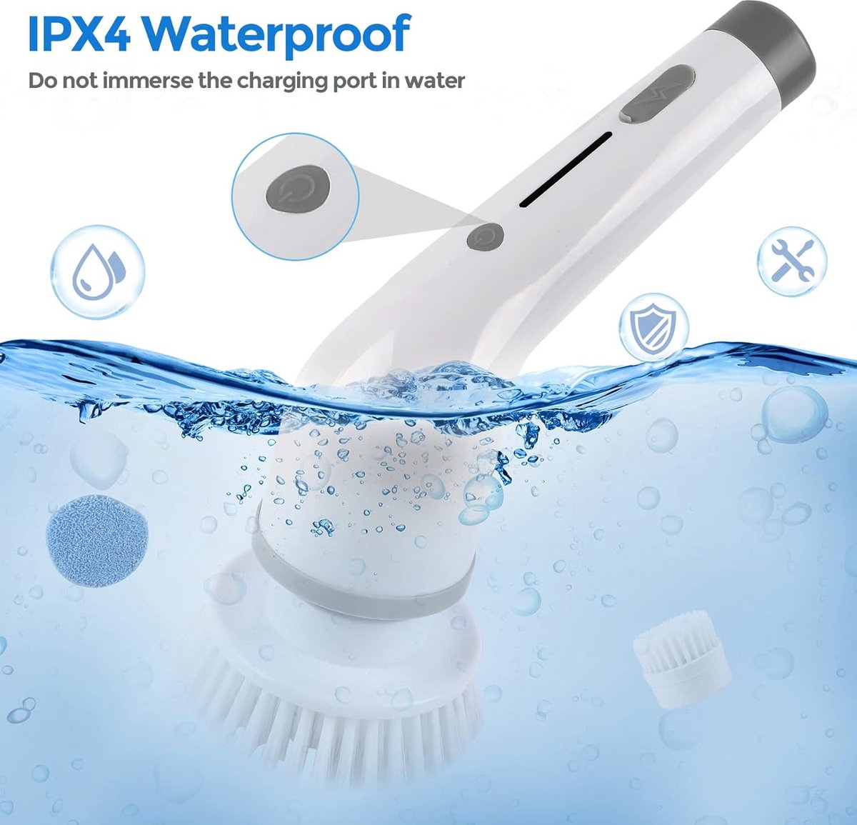 Krachtig en Efficiënt: De elektrische reinigingsborstel set is ontworpen voor maximale reinigingskracht met twee snelheden: ① Lage snelheid: 400r/min; ② Hoge snelheid: 450r/min. Deze centrifugeerborstel is krachtiger dan andere merken en biedt efficiënte reiniging met één druk op de aan/uit-knop.