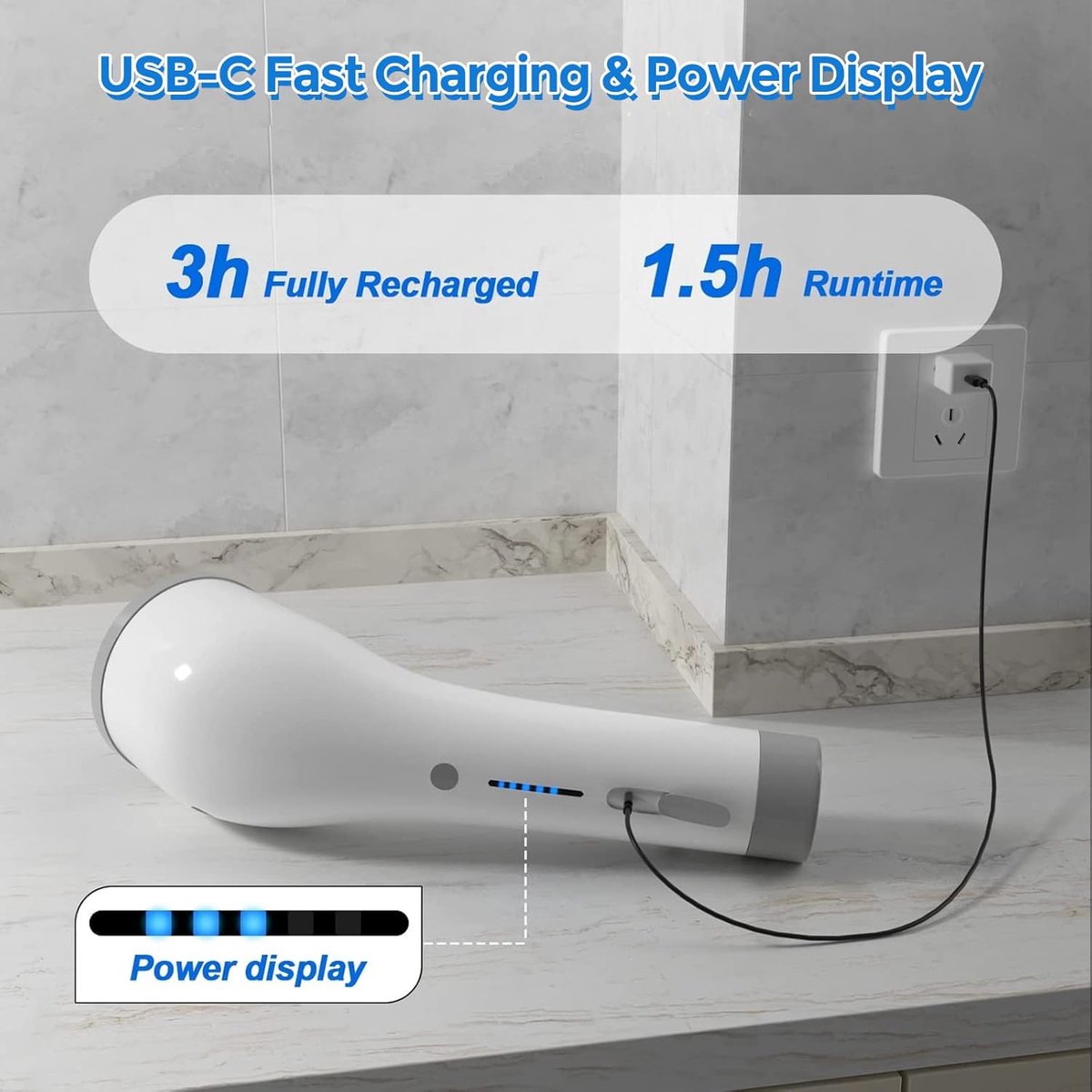 Draadloos en Oplaadbaar: Deze badkamerreiniger borstel is uitgerust met een hoogwaardige 2600mAh batterij voor type-C opladen. Na slechts 3,5 uur snel opladen kan de elektrische borstel tot wel 90 minuten gebruikt worden. Het draadloze ontwerp maakt het schoonmaken eenvoudig en vrij van lange, verwarde snoeren.