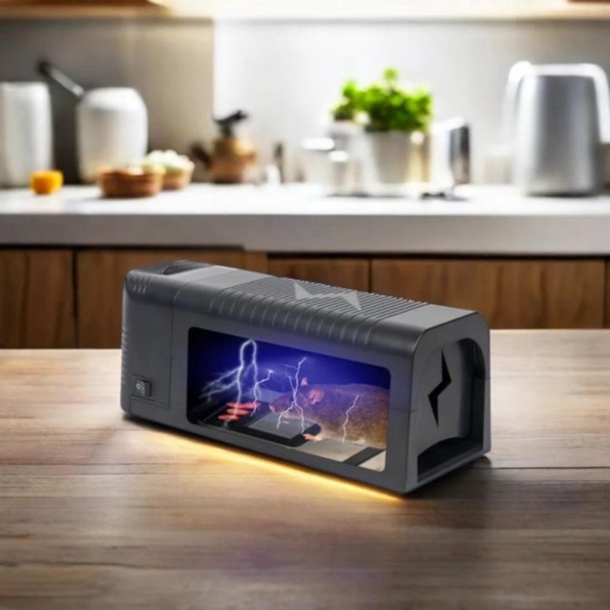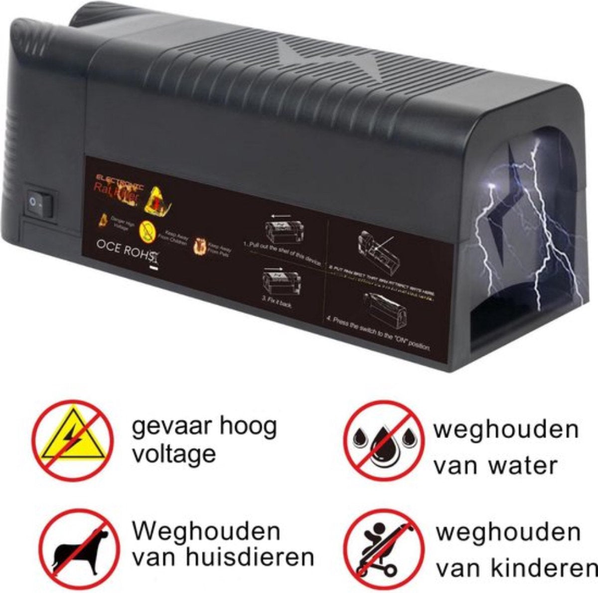 • Schakelt muizen snel en op humane wijze met een hoogspanningsschok uit