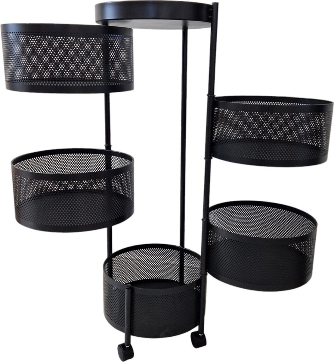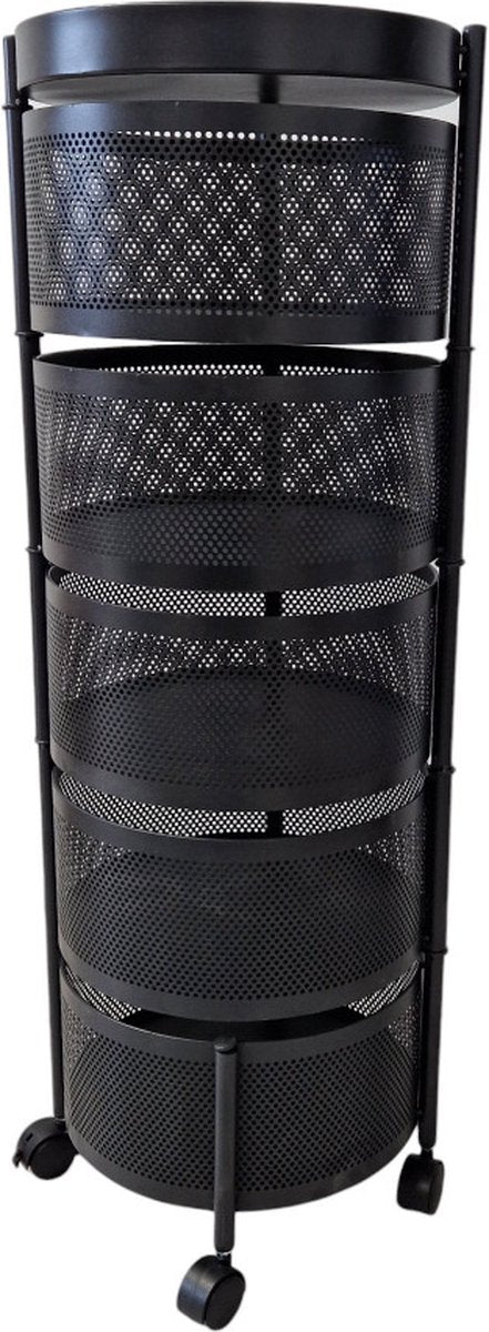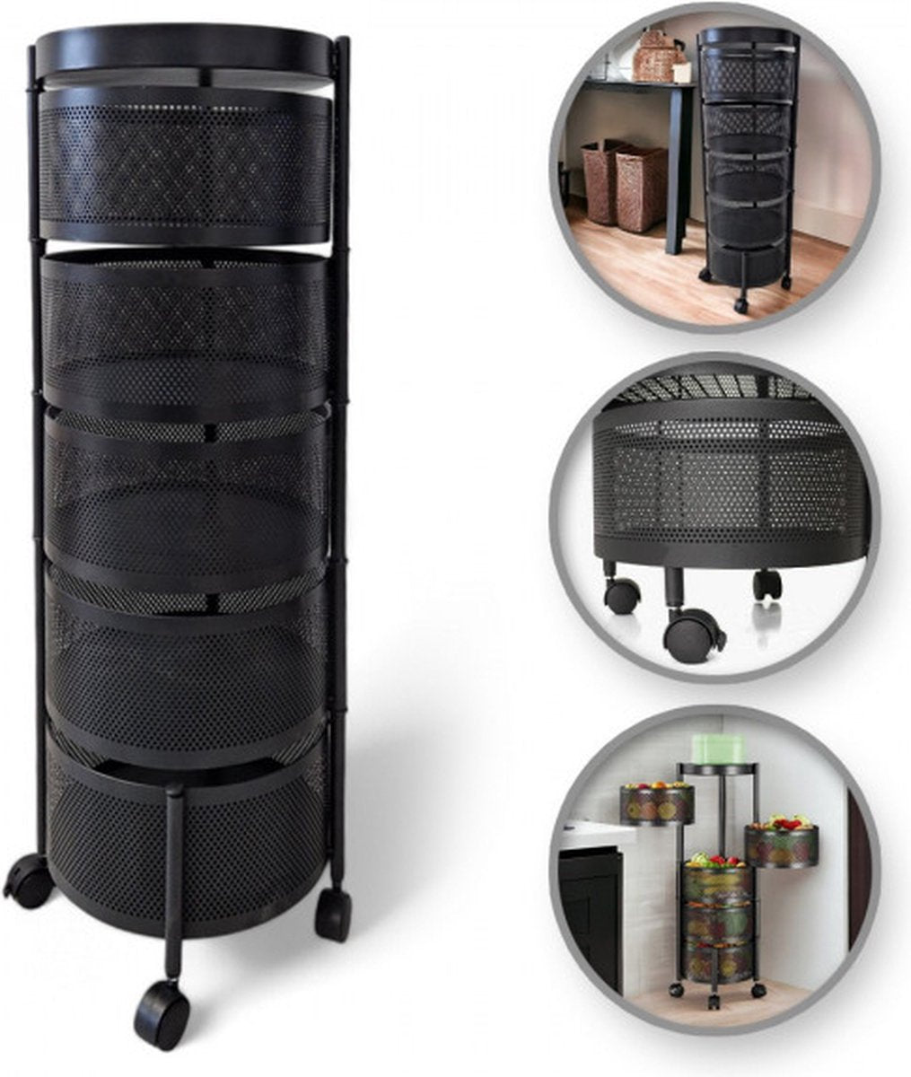 Esem Keukenrek - Opbergmand - Draaibare Mand met 5 Niveaus en Wielen - Zwart Metaal Trolley met Roterende Manden - Trolley op wieltjes