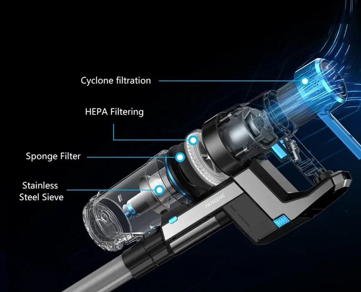 4-staps filtratiesysteem: Het geavanceerde filtratiesysteem vangt 99,99% van de fijne stofdeeltjes op, zodat de lucht die uit de stofzuiger komt schoon is. Dit zorgt voor een schonere en gezondere omgeving, ideaal voor mensen met allergieën.