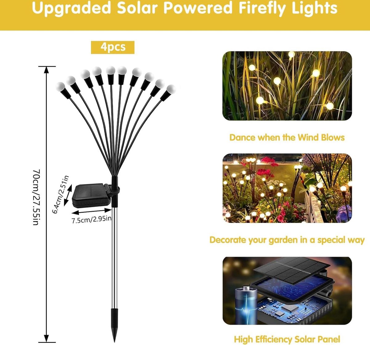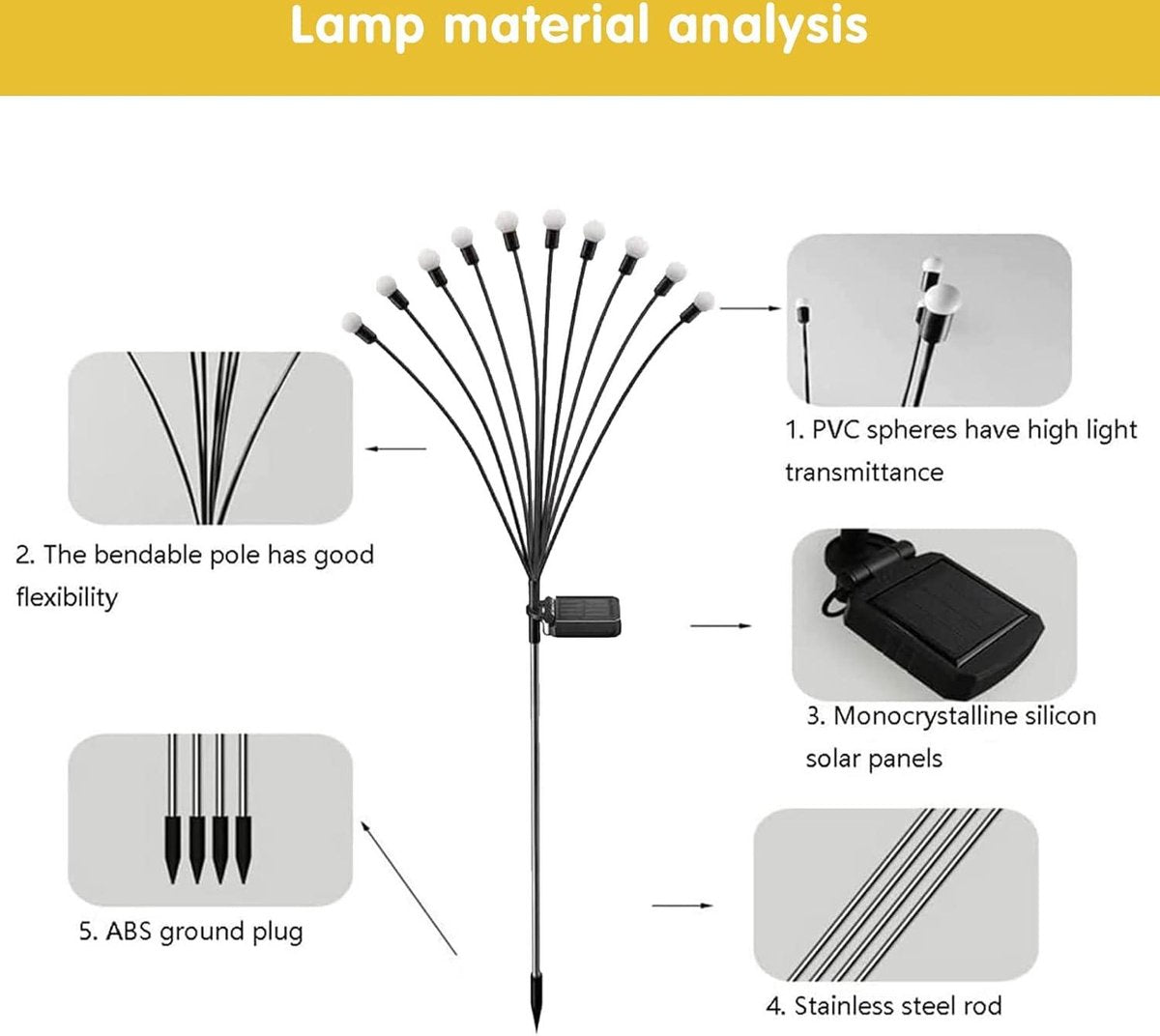 Op zoek naar de perfecte tuindecoratie? Deze gloeiwormpjes met zwaaiende lichten zijn een prachtige toevoeging aan elke buitenruimte. Laat je betoveren door hun schoonheid terwijl ze zachtjes dansen in de wind, vooral 's nachts wanneer de lichten flikkeren en een charmante gloed uitstralen. Met 10 lampkoppen op elke gloeiwormlamp, zorgen ze voor een sfeervolle en magische uitstraling in het donker.