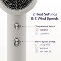 Met 3 temperatuurstanden en 2 snelheden kun je de föhn aanpassen aan je specifieke haarverzorgingsbehoeften. Druk op de hete en koude luchtknop om de luchttemperatuur te wijzigen, en kies de tweede windsnelheid voor sterke hitte of sterke koude lucht. Dit maakt het eenvoudig om je haar te stylen en te verzorgen.