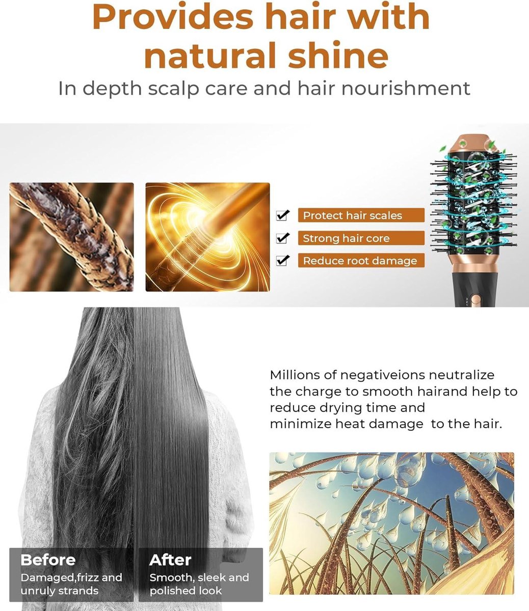 Met de föhnborstel met warme luchtborstel inclusief 6 verwisselbare borstelopzetstukken wordt het föhnen, gladmaken, krullen, volume geven en masseren van de hoofdhuid eenvoudig. Creëer verschillende kapsels voor diverse haarlengtes met deze ronde borstelhaarset. De prachtige verpakking maakt het ook ideaal als cadeau voor vrienden, familie of geliefden.