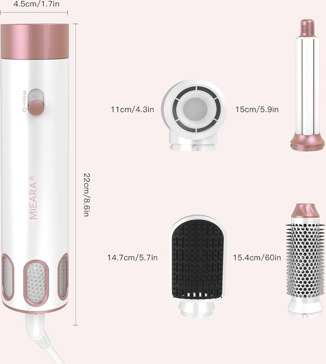 De nieuwe 5-in-1 heteluchtstyler van 2023 biedt een combinatie van hoge luchtsnelheid en een laag geluidsniveau om je haar te beschermen tegen hitteschade. Met 5 verwisselbare opzetstukken is deze styler perfect om aan al je stylingbehoeften te voldoen.