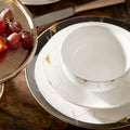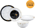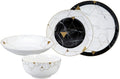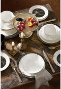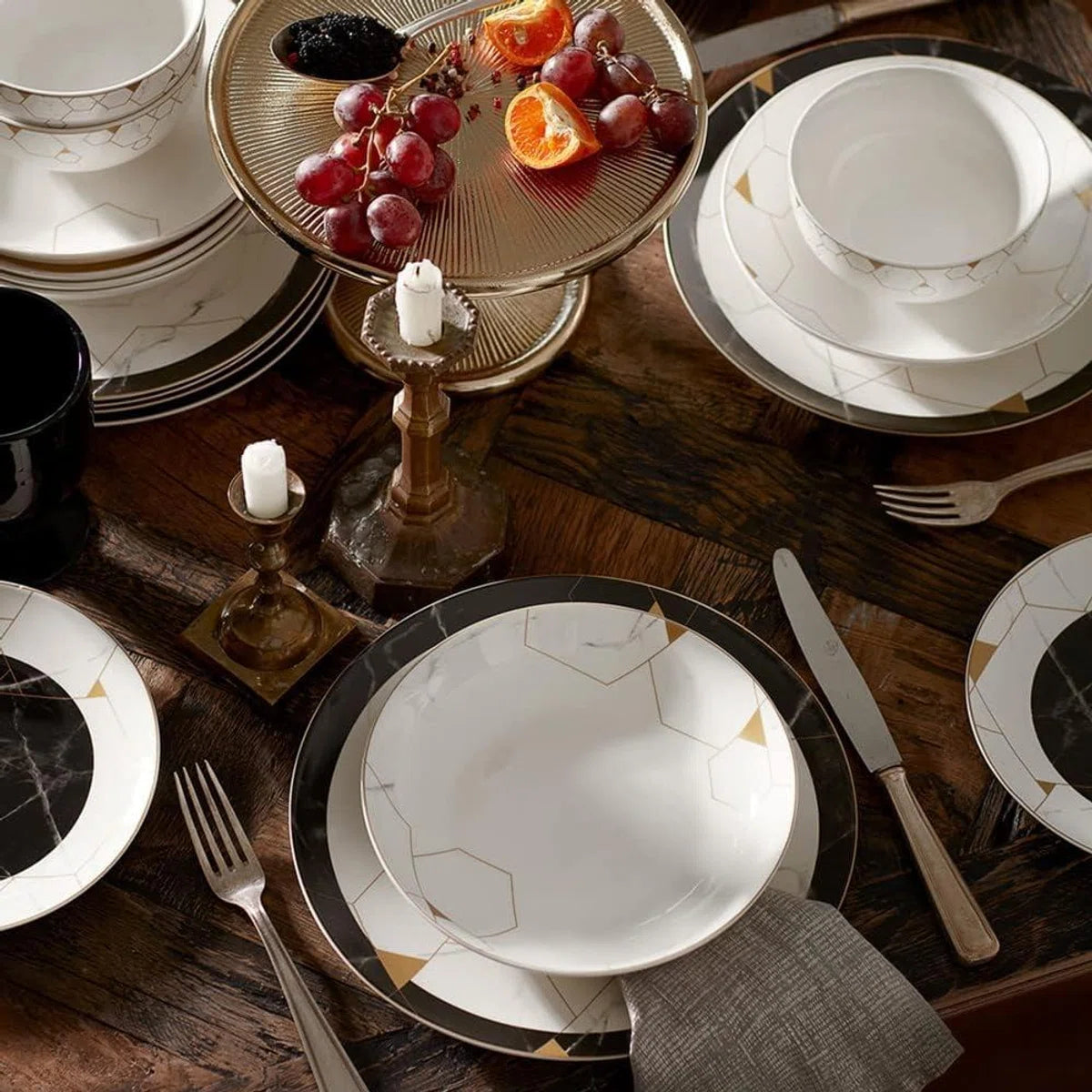 Karaca Gem Porselein Tafelservies - 24-Delig - Modern en Elegant OntwerpUpgrade je eettafel met dit prachtige Karaca Gem tafelservies voor 6 personen. Het fijne porselein in elegant wit met filigraan goudkleurige versieringen voegt een vleugje luxe toe aan elke maaltijd. De set bestaat uit 6 serveerborden (27 cm), 6 taartborden (20 cm), 6 diepe borden (20 cm) en 6 soepkommen (14 cm).Het ontwerp van het tafelservies combineert elegantie met moderniteit, met speciale aandacht voor details zoals de zwart gekleurde rand op het grote bord. Elk stuk is zorgvuldig ontworpen om jouw gerechten prachtig te presenteren en een verfijnde sfeer te creëren.Om de decoratie van het servies te behouden, raden we aan om het met de hand te wassen. Upgrade je eettafelervaring met dit hoogwaardige en esthetisch ontworpen Karaca Gem tafelservies.