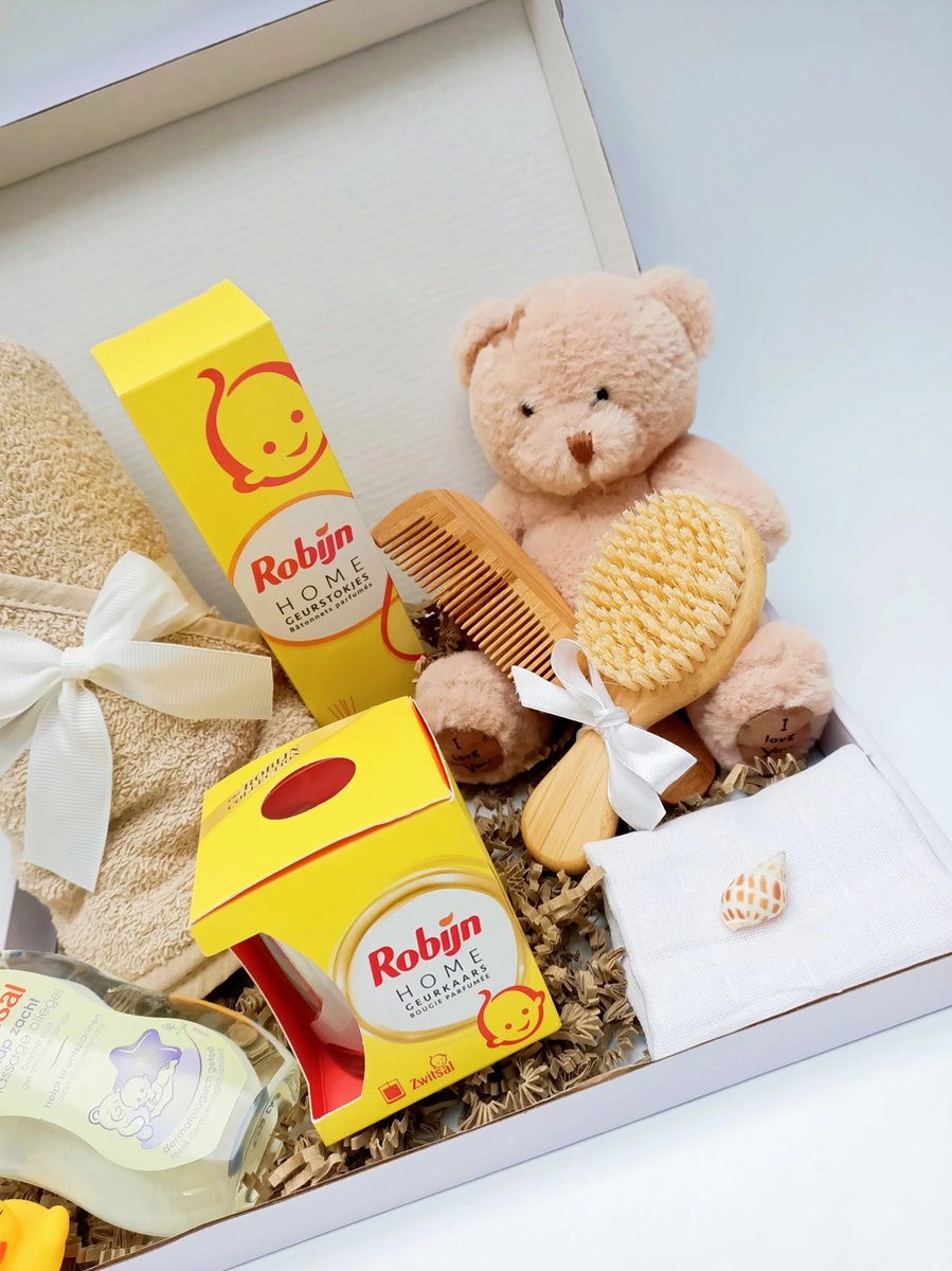 Een zwitsal geurstokjes, een zwitsal geurkaars, een Zwitsal olie 200ml, Bad eend, kam en borstel set, Badcape grijs, Hydrofiel washandje, En een Knuffel beer.