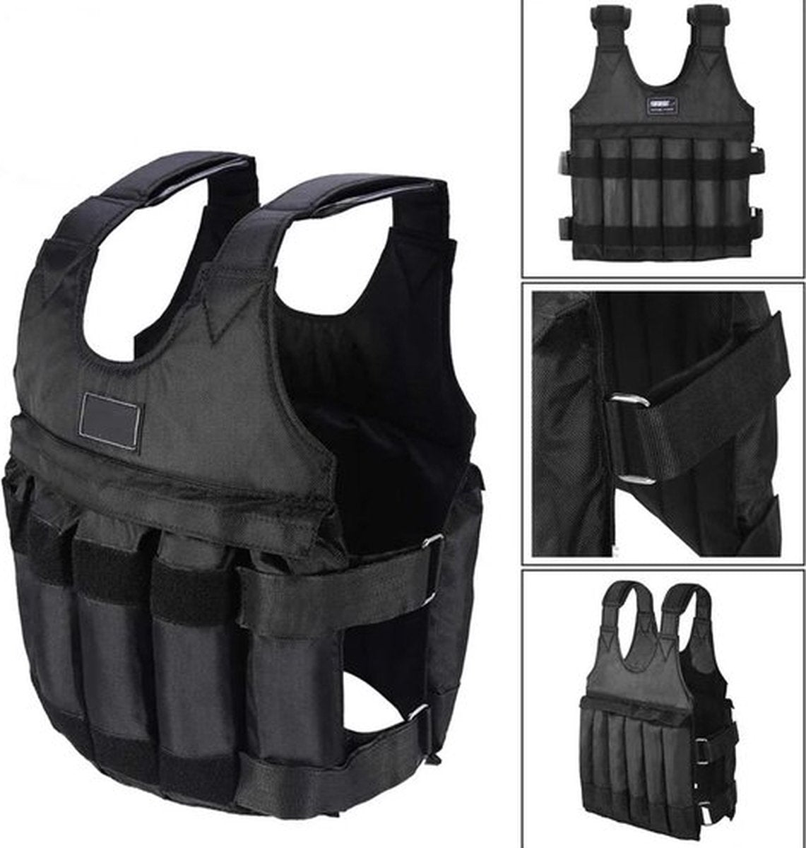 Twee stukken voor en achter, elk stuk van 6 roosters, een totaal van 12 roosters, de maximale belasting van 50kg. De schouders zijn gewatteerde schouders om de stress op de schouders te verminderen en ze comfortabeler te maken. Kan worden geladen met zand, ijzerzand, stalen plaat