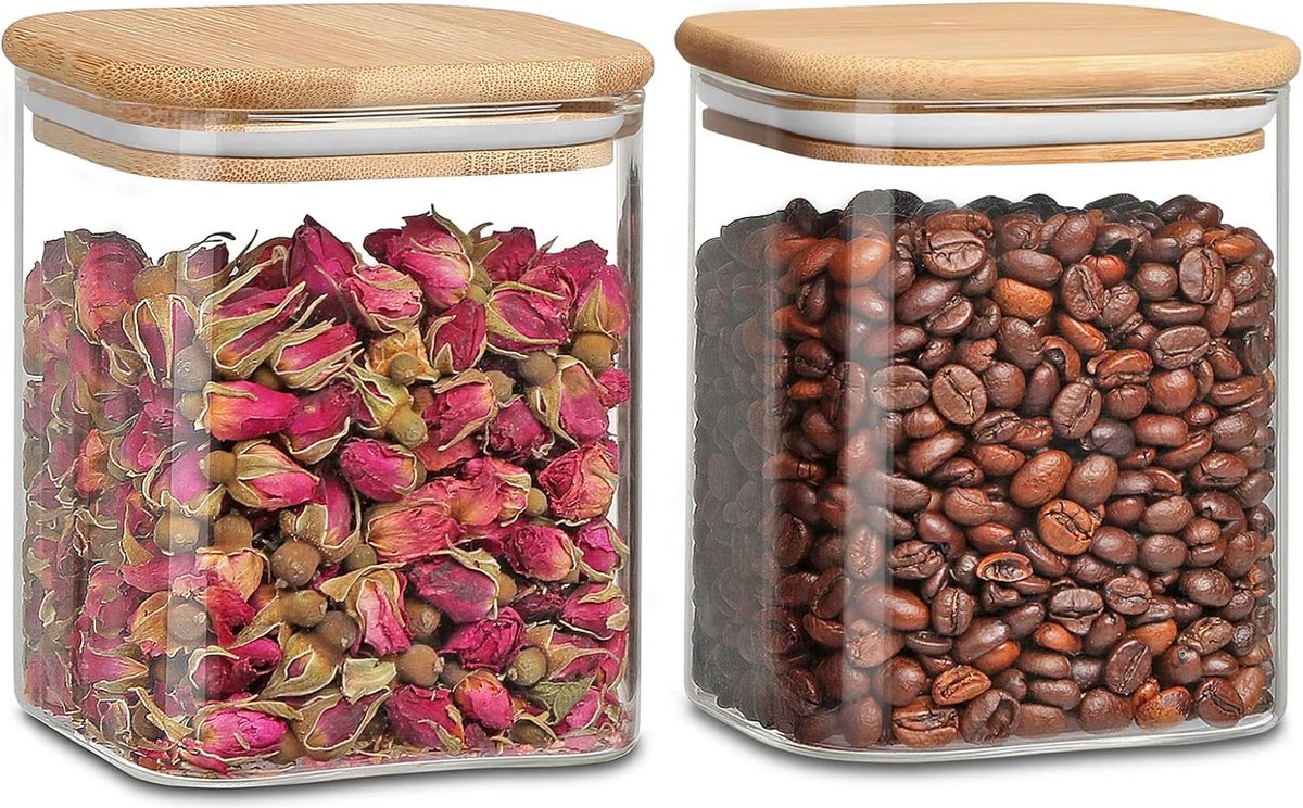 Glazen Potten met Deksels,Keuken Opslag Containers met Luchtdichte Bamboe Deksels Voor Het Bewaren Van Pasta Noedels Bonen Koffie Granen Rijst Koekjesmoer,Grote Capaciteit Transparant Glas opslag Potten 2 Pack 800ml