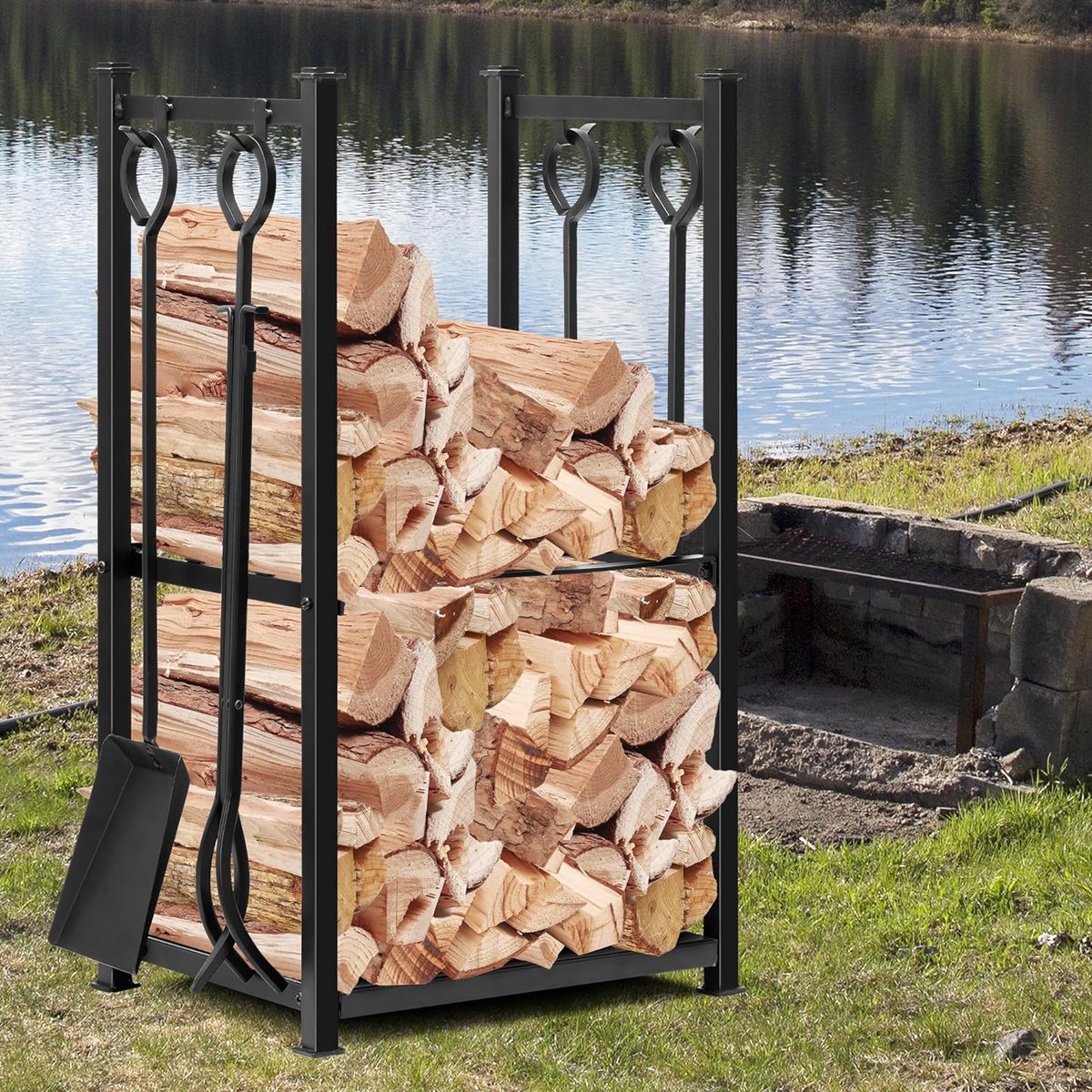 Haardhoutrek met 4 haardgereedschap, 72 x 46 x 30 cm, voor binnen, brandhoutstandaard, voor buiten, houten rek, 2 planken, smeedijzer, brandhoutrek