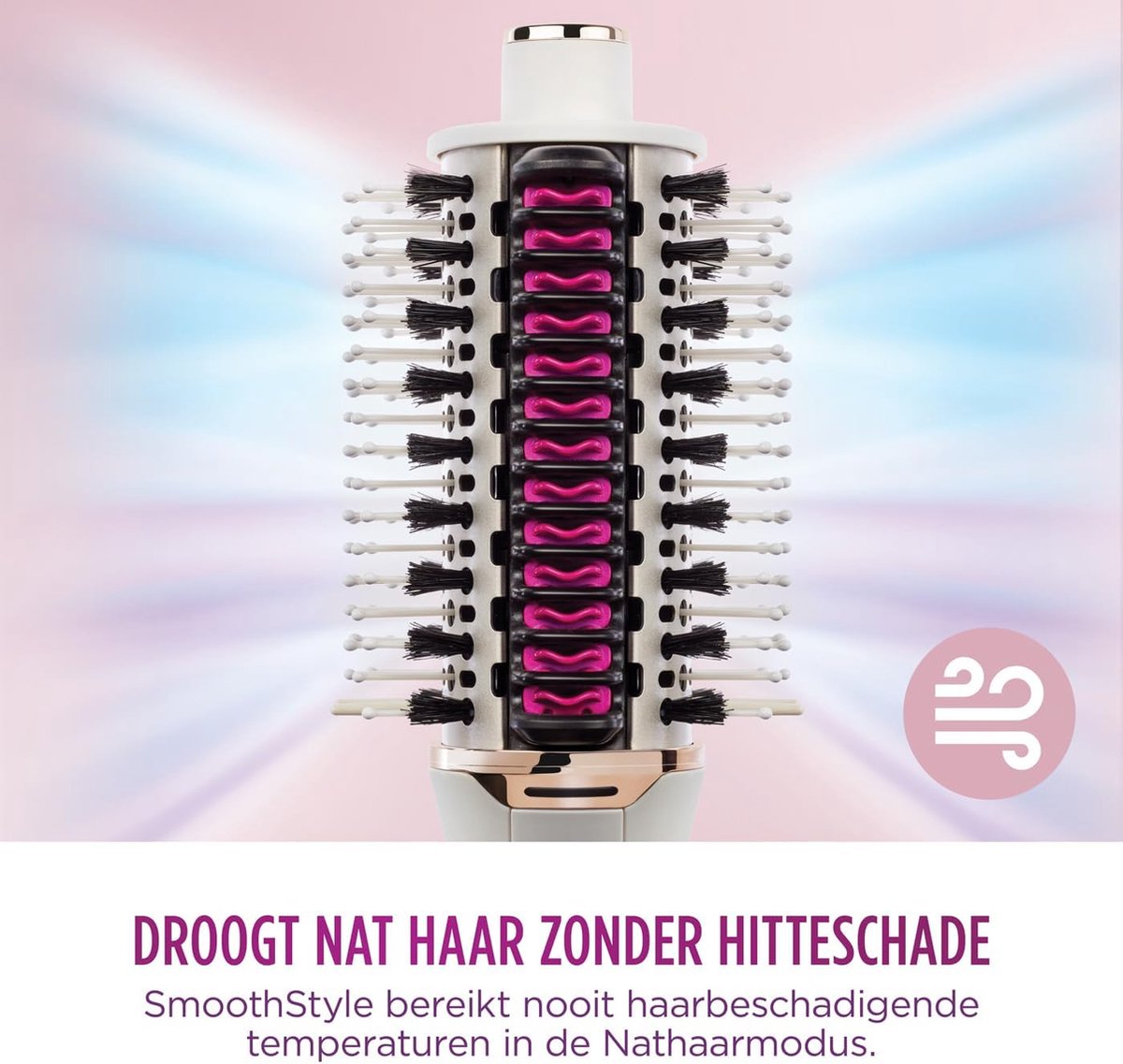 - Nat Haar Modus: Droog, geef volume en style je haar zonder het risico op warmtebeschadiging. In deze modus bereikt de SmoothStyle nooit temperaturen die je haar kunnen beschadigen. Kies uit 3 luchttemperaturen voor de perfecte instelling.