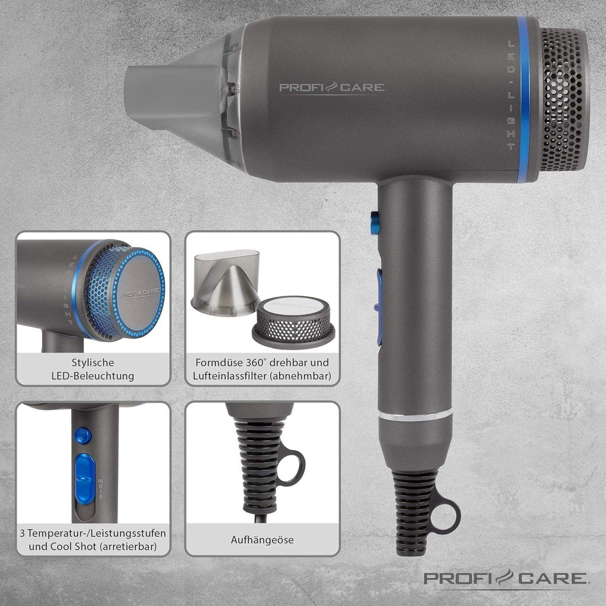 Het elegante ontwerp van de föhn bevat blauwe LED-verlichting, hoogwaardige roestvrijstalen inleg en een verwijderbaar luchtinlaatfilter. Daarnaast is de föhn voorzien van oververhittingsbeveiliging en een handig ophangoog voor opslag.