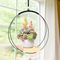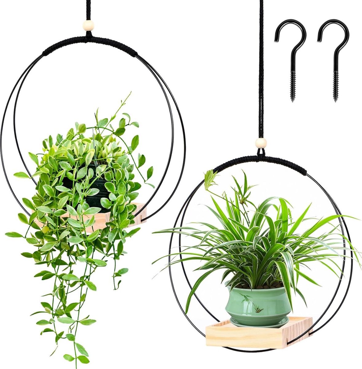 Hangende plantenbakken - 2 stuks Sumotia met houten sokkel metalen ring en ophanglus - ronde zwarte plantenbakken voor binnen, muren en plafonds