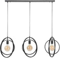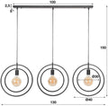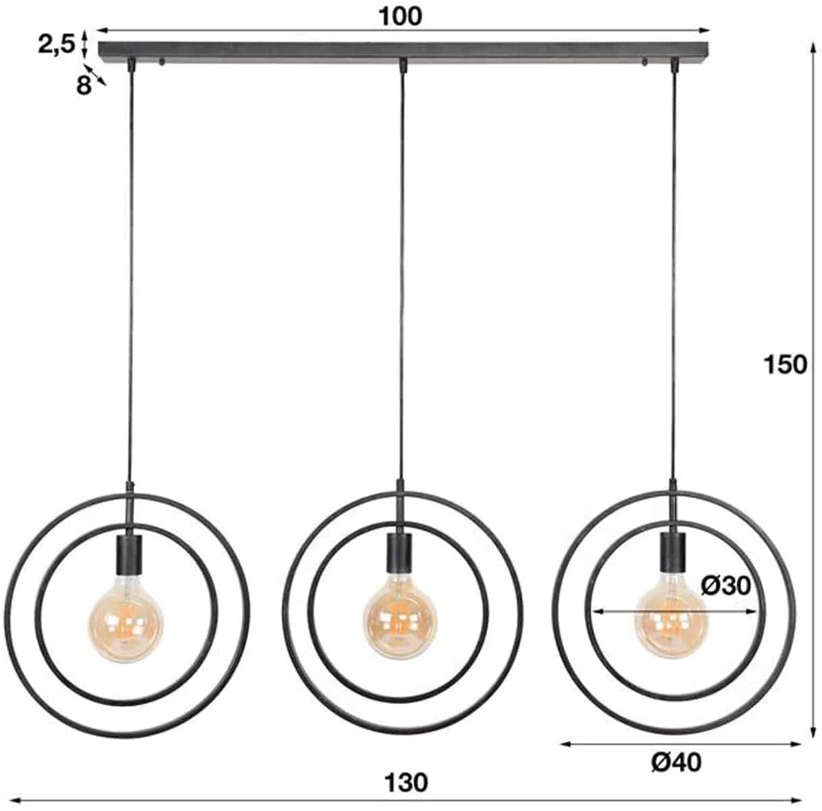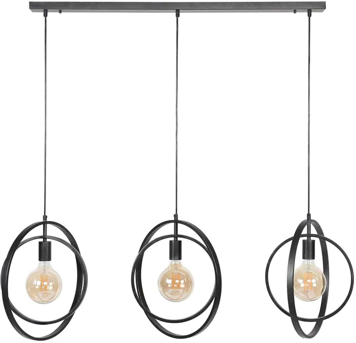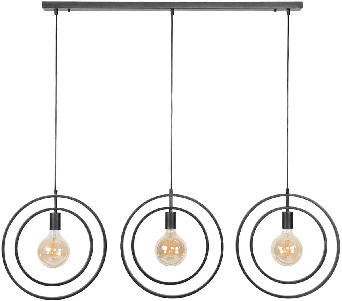Landelijke 3-lichts eettafellamp, behorend tot de serie Turn Around. Een speelse en stijlvolle hanglamp die echt een eyecatcher is boven je tafel. De buitenste cirkels zitten vast aan de stroomkabels en de binnenste cirkels kunnen volledig ronddraaien. Hierdoor kan je de cirkels naar eigen ingeving plaatsen. De zwarte stroomkabels zijn in hoogte verstelbaar tot een maximale hoogte van 150 centimeter. Het armatuur is gemaakt van metaal en heeft een charcoal finish.