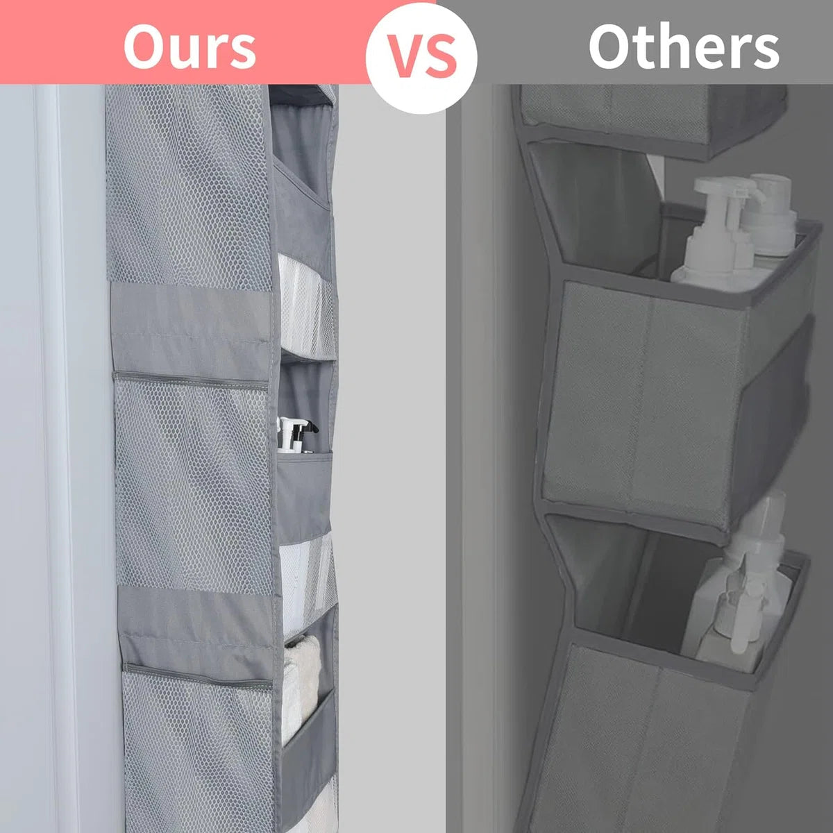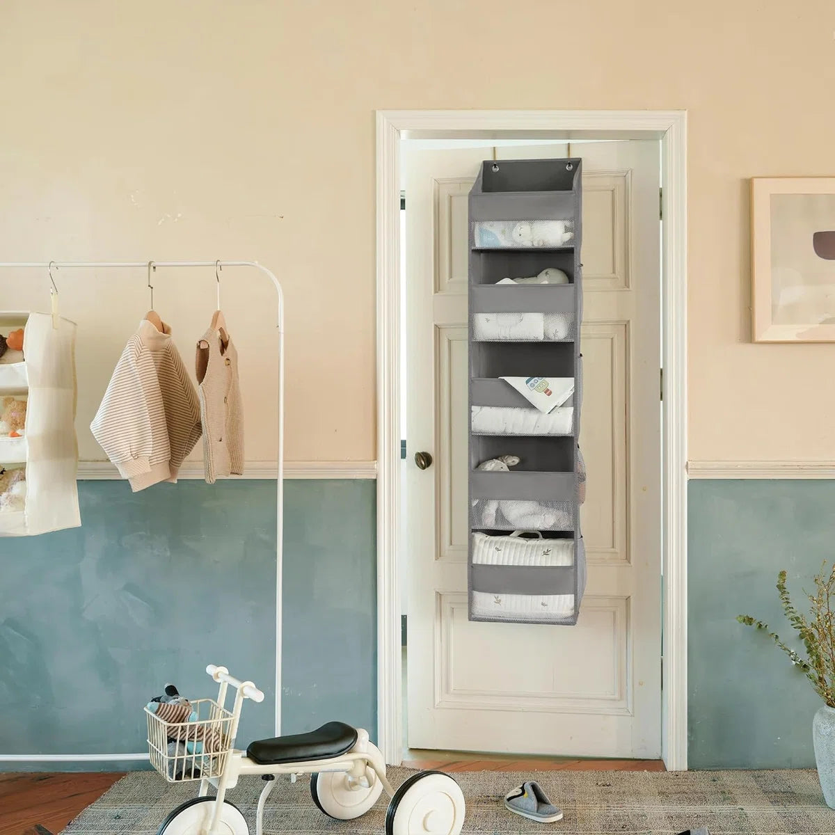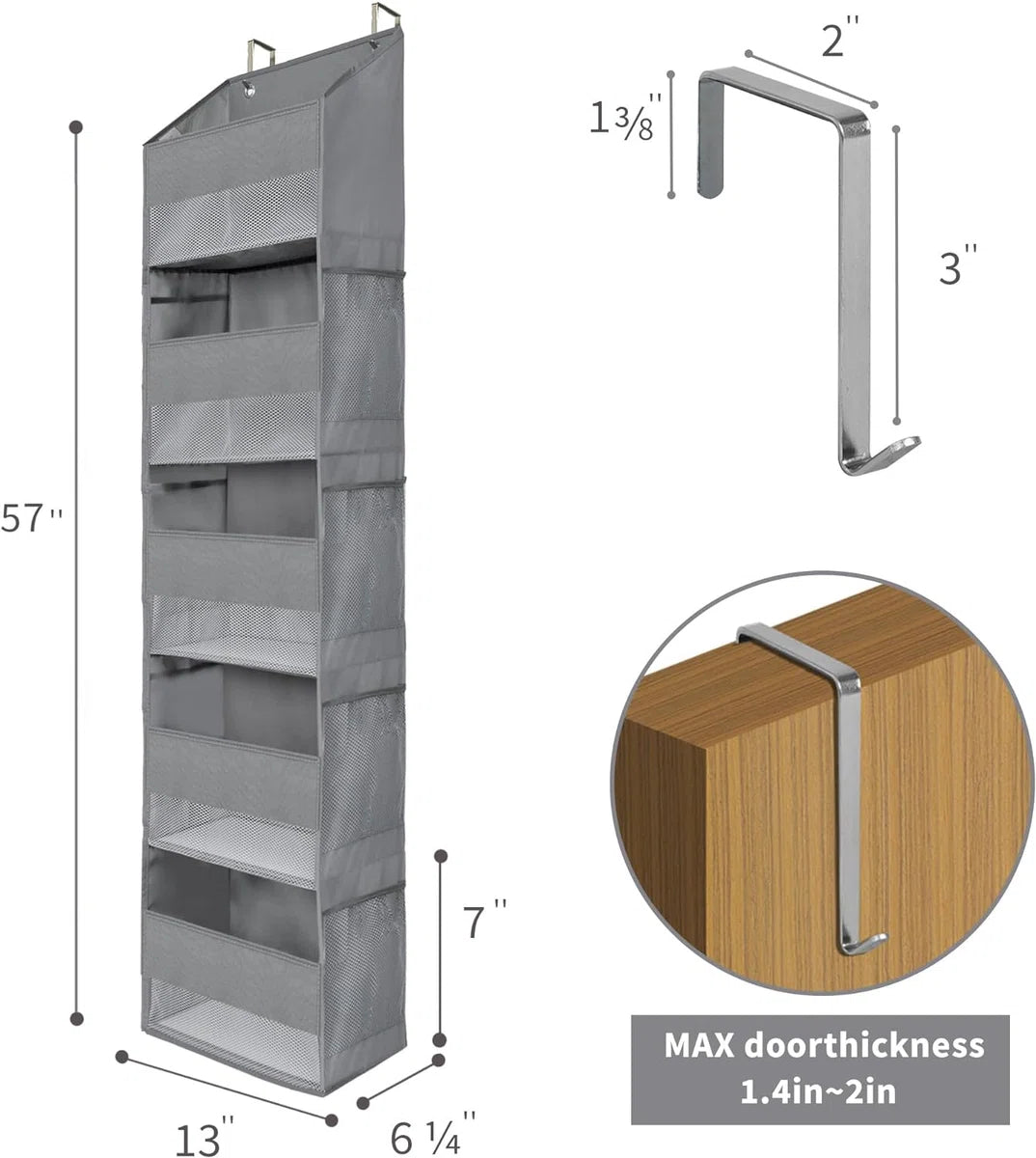 Grote inhoud: met de afmetingen 34 x 16 x 150 cm (l x b x h) is de deurorganizer groot genoeg om veel kinderspullen, handdoeken, haar- en make-upproducten enz. op te bergen. En het hangrek is licht en eenvoudig te monteren. Gegarandeerd geen doorhangen - het genaaide ontwerp tussen de zakken zorgt ervoor dat ons product perfect horizontaal blijft. Elke plank van het deurrek om op te hangen heeft een stabiele plank, zodat hij zijn vorm goed houdt en ook bij zware lasten niet vervormt of doorhangt. 8 netvakken aan de zijkant: de deurorganizer voor de kinderkamer achter de deur is uitgerust met zijdelingse netvakken, waarin handschoenen, haarbanden, sleutels, brillen en andere kleinigheden netjes kunnen worden bewaard. Met deze praktische zijzakken was het nog nooit zo eenvoudig om kleine voorwerpen op te bergen en terug te vinden. Doorzichtig mesh-venster: het netvak aan de voorkant van deze opbergbox achter de deur maakt het mogelijk om de inhoud van de afzonderlijke vakken te zien. Zeg vaarwel tegen browsen en verwelkom een efficiënte organisatie. Veelzijdig en praktisch: de deurorganizer is zo ontworpen dat hij verschillende voorwerpen zoals speelgoed, luiers, vochtige doekjes, babyhanddoeken, sokken, cosmetica, haardrogers, krultangen en nog veel meer kan bevatten. Zijn veelzijdigheid maakt hem tot een ideale opbergoplossing voor de kinderkamer, de badkamer of zelfs achter de deur in elke ruimte.