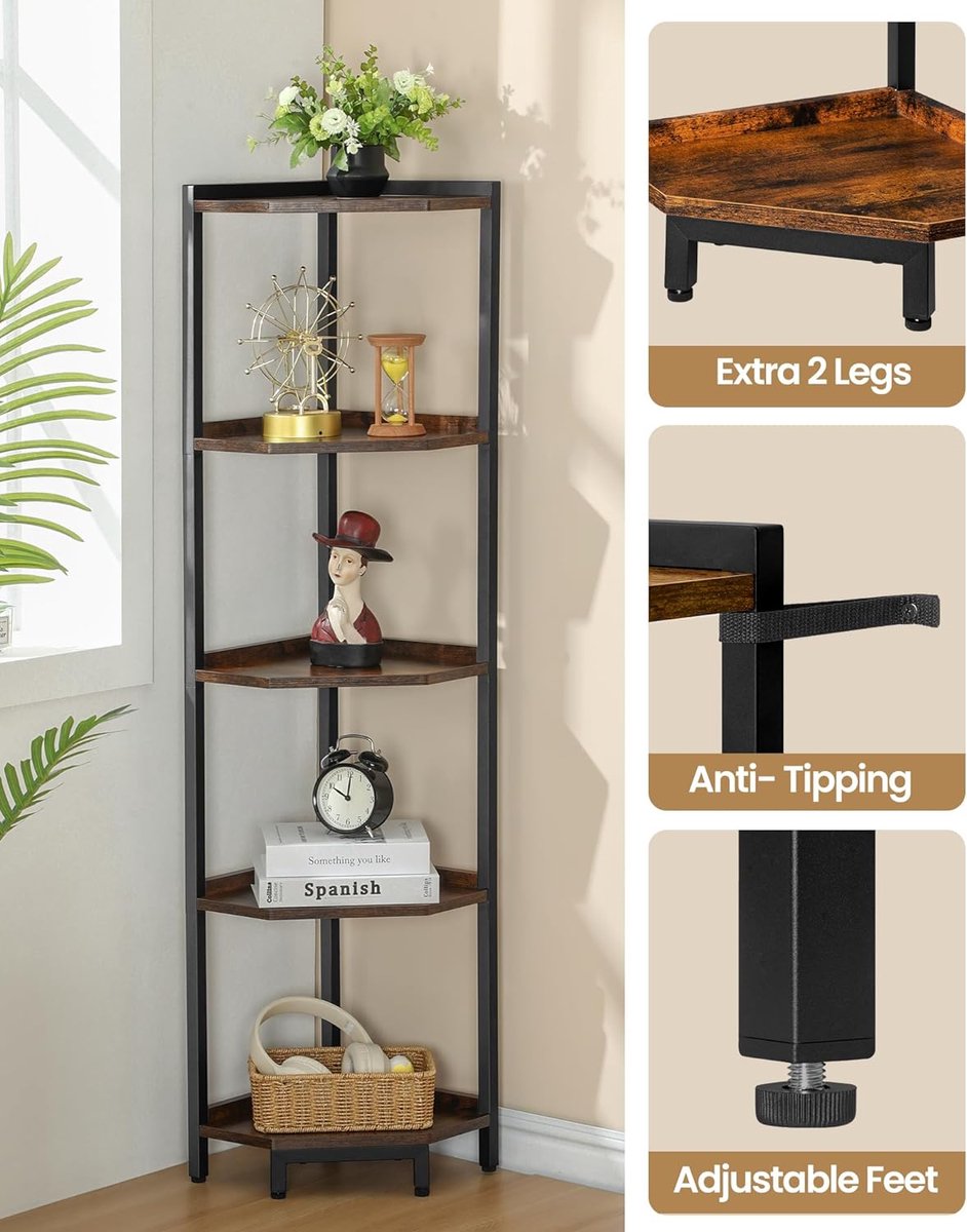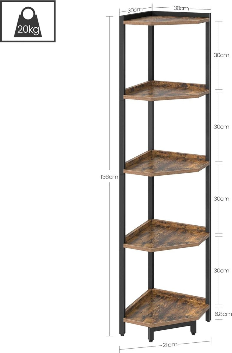 Hoekplankstandaard, 5-laags hoekboekenkast, opbergstandaard met metalen frame, plantenstandaard, hoekboekenkast voor woonkamer, thuiskantoor, rustiek bruin en zwart