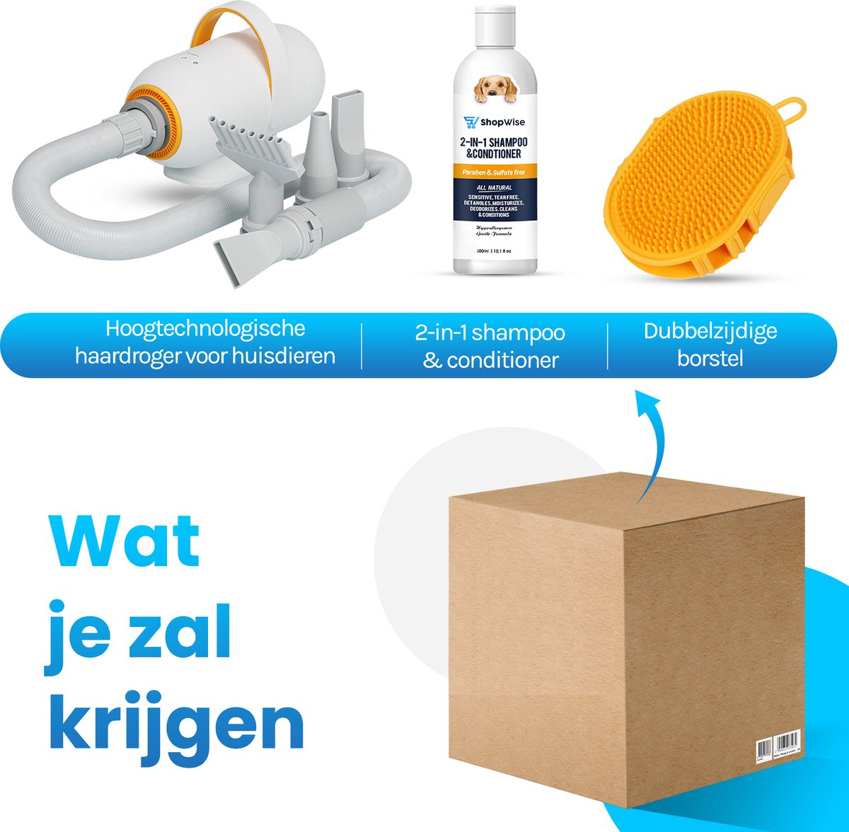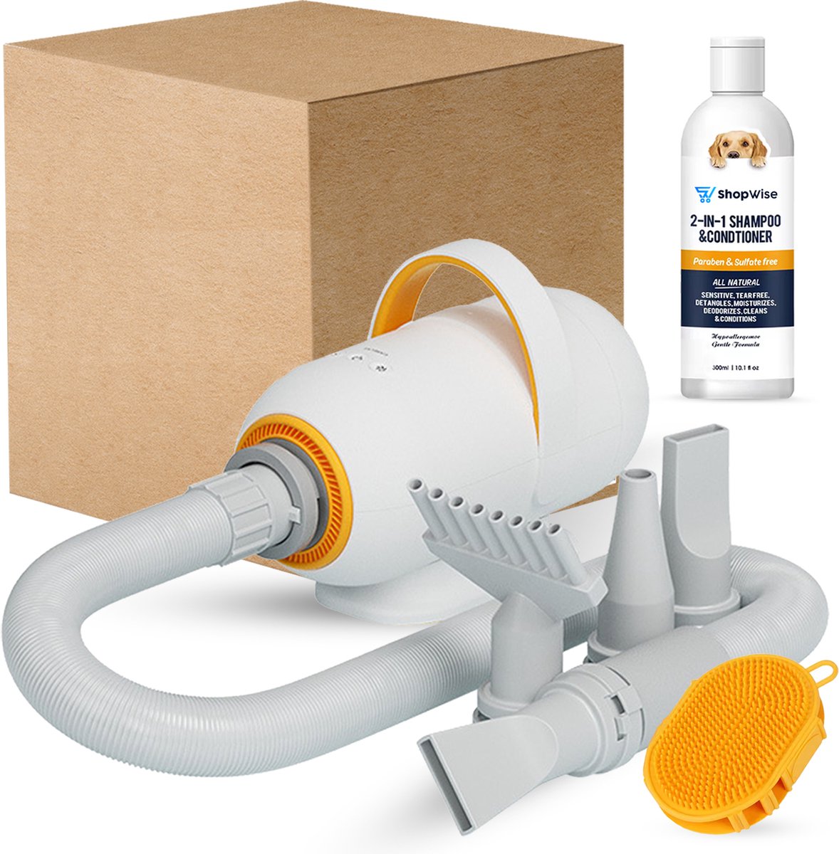 Bij deze hondenfohn krijg je handige extra's zoals shampoo en een borstel om je vriendelijke viervoeter nog meer te verwennen.