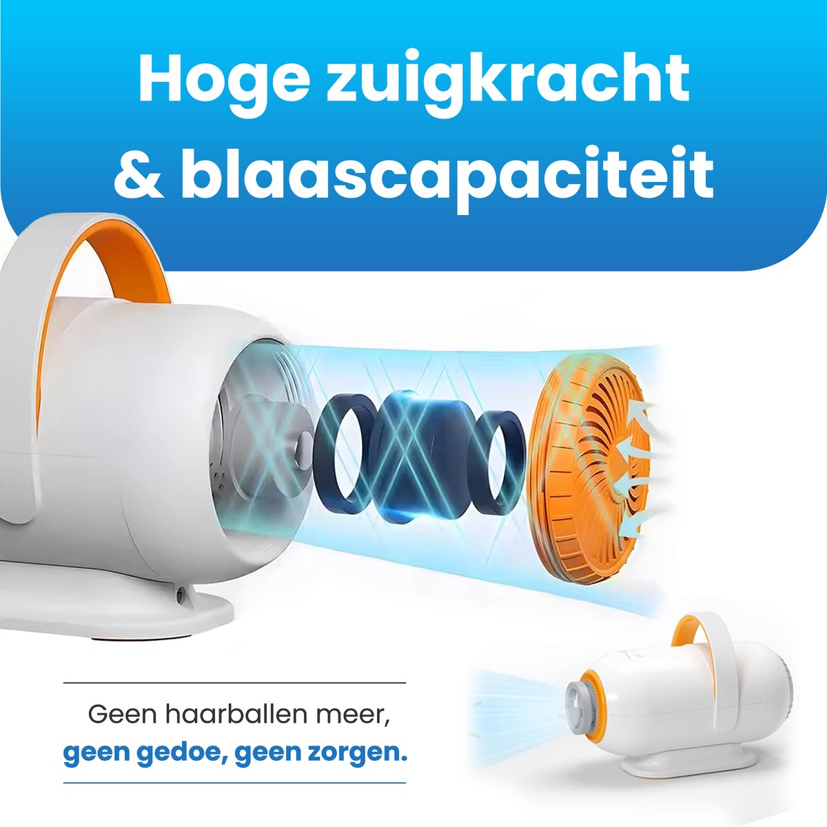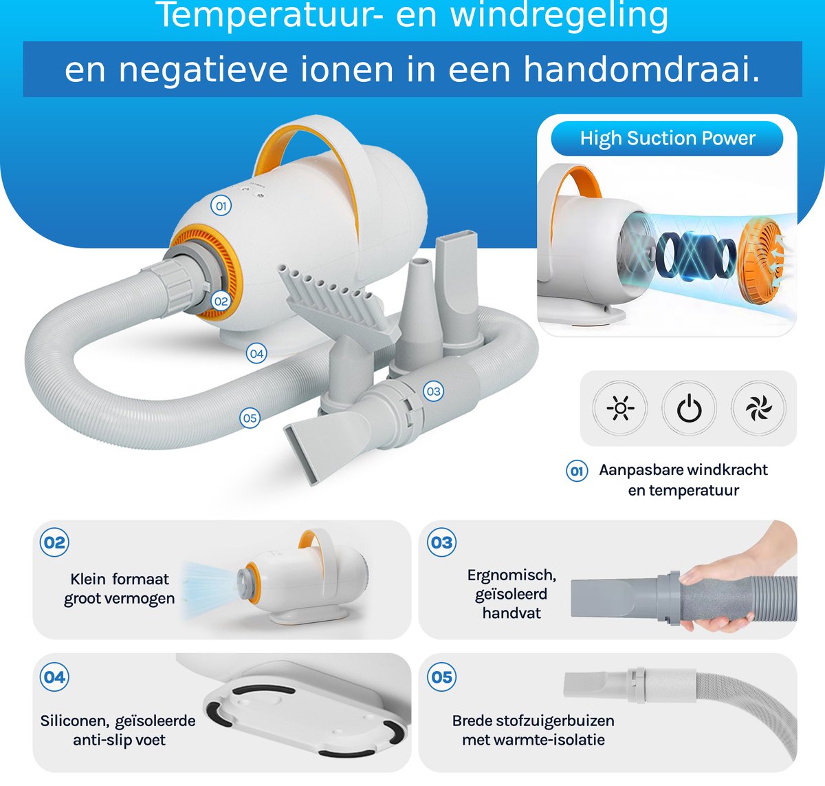 De hondenfohn heeft een revolutionaire blaas- en zuigfunctie. In tegenstelling tot onze concurrenten, die enkel een blaasfunctie aanbieden. Dit in combinatie met de vele extra accessoires maakt onze hondenfohn de meest complete keuze.