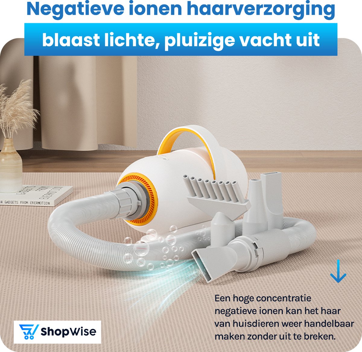 • Met de hondenfohn blaas en zuig jij je harige vriendje droog in een handomdraai.