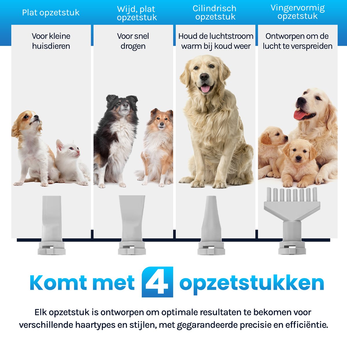 De 4 opzetstukken die bij de Hondenfohn worden geleverd, zijn geschikt voor verschillende doeleinden. Zo kun je de föhn aanpassen aan de vacht van je hond, of deze gebruiken voor het verwijderen van losse haren of het masseren van de huid. De opzetstukken zorgen voor een veelzijdige en effectieve verzorging van je huisdier.