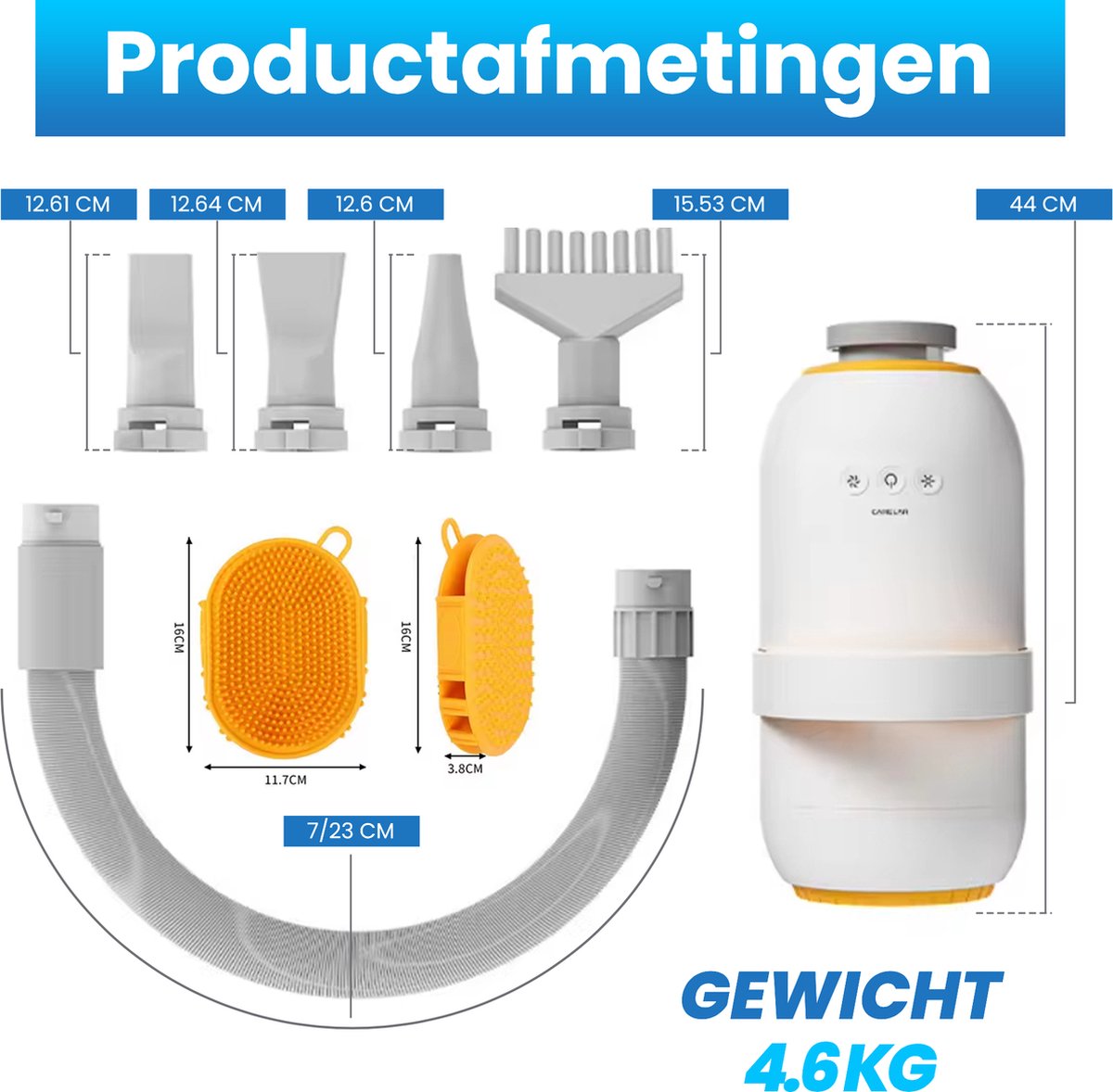 Het nieuwe geoptimaliseerde model van de hondenfohn is voorzien van een blaas- en zuigfunctie. In tegenstelling tot concurrenten die alleen een blaasfunctie aanbieden. Ook heeft ons model een stillere motor, waardoor het gebruik nog comfortabeler is voor zowel jou als je hond. Daarnaast worden er ook 4 opzetstukken meegeleverd, zodat je de föhn kunt aanpassen aan de behoeften van je huisdier. Je krijgt altijd de beste waarde voor je geld. Daarom leveren wij naast al deze verbeteringen ook gratis shampoo en een borstel bij je bestelling.