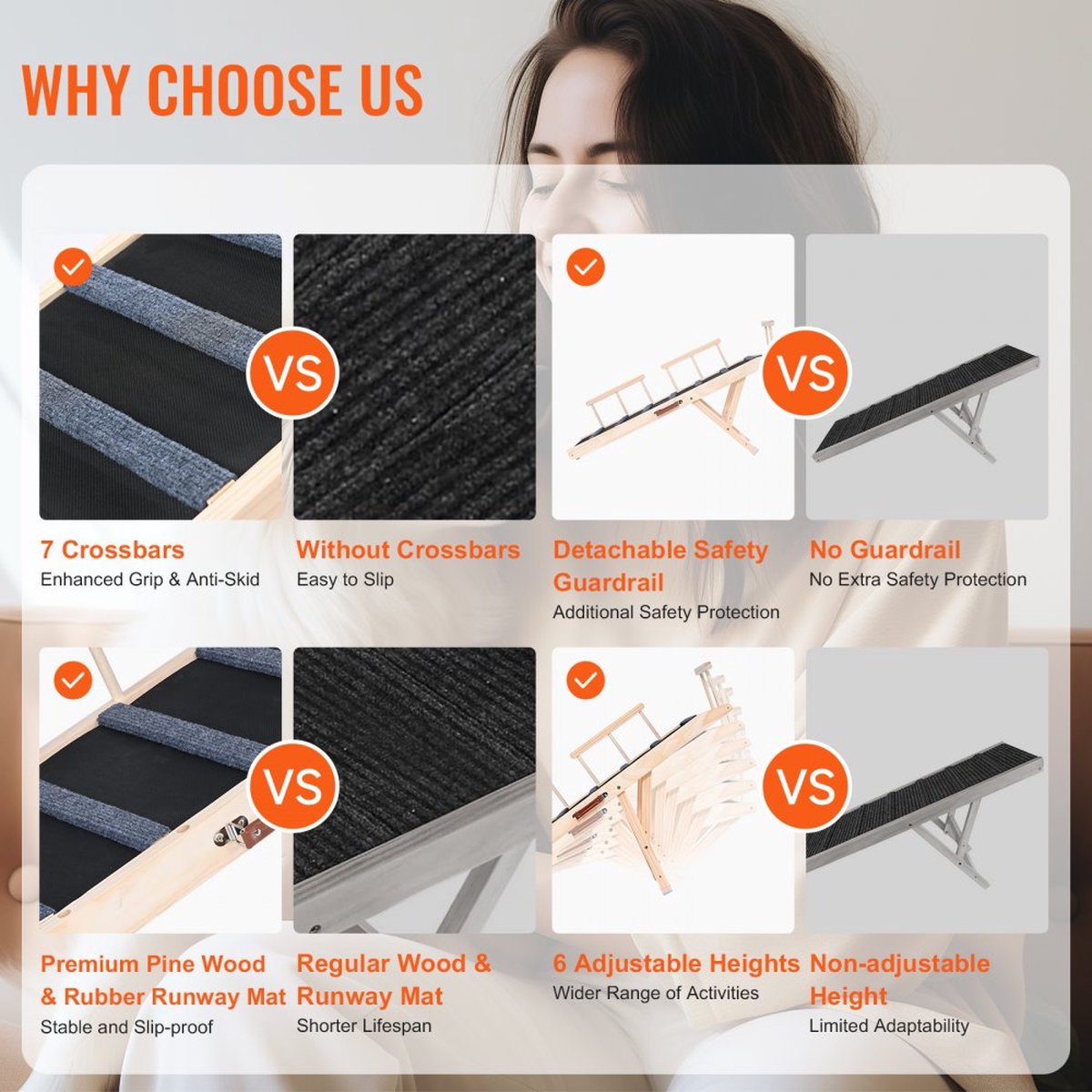 Hoge tractie en antislipoppervlak: de hondenoprit is voorzien van een rubberen tapijt met hoge tractie en groeven, waardoor uw huisdier een veilig en antislipoppervlak krijgt. Het ontwerp van de oprit omvat 7 dwarsbalken die extra grip bieden om uitglijden en vallen tijdens beklimmingen te voorkomen.Stevig en duurzaam: deze verstelbare hondenloopplank van massief hout is gemaakt van hoogwaardig grenenhout en is uitzonderlijk stabiel en kan huisdieren met een gewicht tot 250 kg ondersteunen. De toevoeging van zachte rubberen voetzolen aan de onderkant zorgt voor stabiliteit tijdens de beklimming van uw huisdier.6-niveaus verstelbare hoogtes: Met 6 verstelbare hoogte-instellingen (13,8''/35cm, 17,7''/45cm, 20,3''/52cm, 22,8''/58cm, 25,6''/65cm, 27,6''/70cm), kunt u U kunt de hoogte van de oprit voor huisdieren eenvoudig aanpassen aan uw specifieke behoeften. Let op: het is niet geschikt voor een bedhoogte van meer dan 70 cm.Geen montage vereist: deze hondenoprit voor bed wordt volledig gemonteerd en klaar voor gebruik direct uit de doos geleverd, wat hem ongelooflijk handig maakt. Hij is ook opvouwbaar voor eenvoudig opbergen, compact en lichtgewicht, waardoor hij moeiteloos kan worden vervoerd. Vouw hem eenvoudig op en berg hem op in uw auto of SUV.Veelzijdig gebruik: met een totale afmeting van 47,2 x 16,5 x 2,4 inch kan deze opvouwbare oprit voor huisdieren moeiteloos onder het bed, de bank, in de auto, vrachtwagen, SUV en meer worden geplaatst. Het biedt uw huisdier gemakkelijke toegang tot deze gebieden zonder veel ruimte in beslag te nemen.