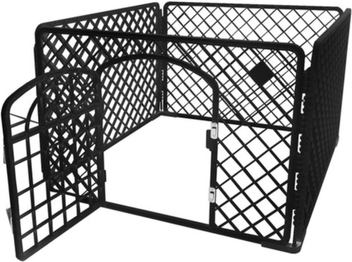 • De praktische ren bestaat uit 4 wanden. In een van hen is er een poortje waardoor het huisdier naar binnen kan gaan. De Individuele wanden zijn verbonden door middel van speciale pennen.