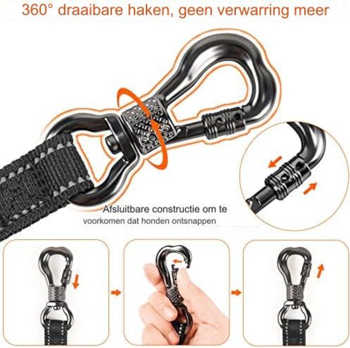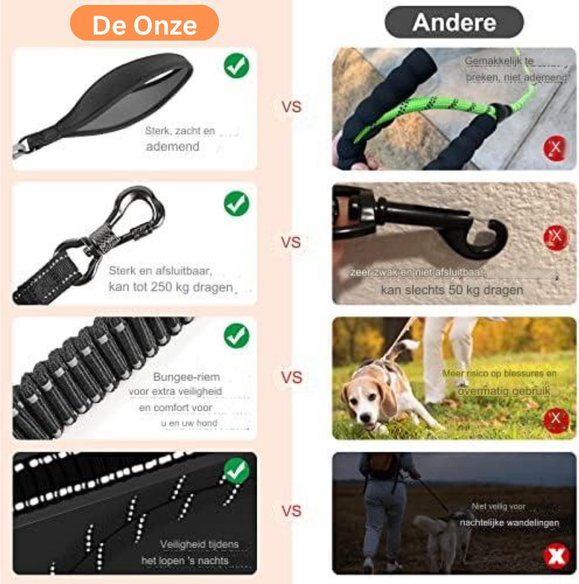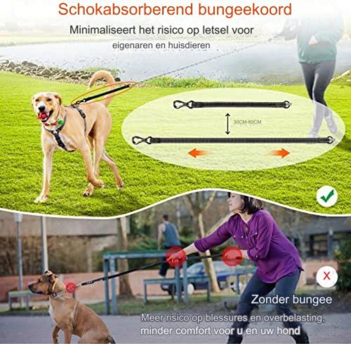 - Schokabsorberende bungeelijn – onze hondenrenlijn heeft een schokabsorberend reflecterend bungeetouw. Deze bungeelijn maakt gebruik van de innovatieve Zero Shock BUNGEE-technologie, perfect voor controle en dempt het trekken, vertraagt effectief de spanning van de hand, vermindert moeizame tractie, waardoor honden prettig kunnen lopen.