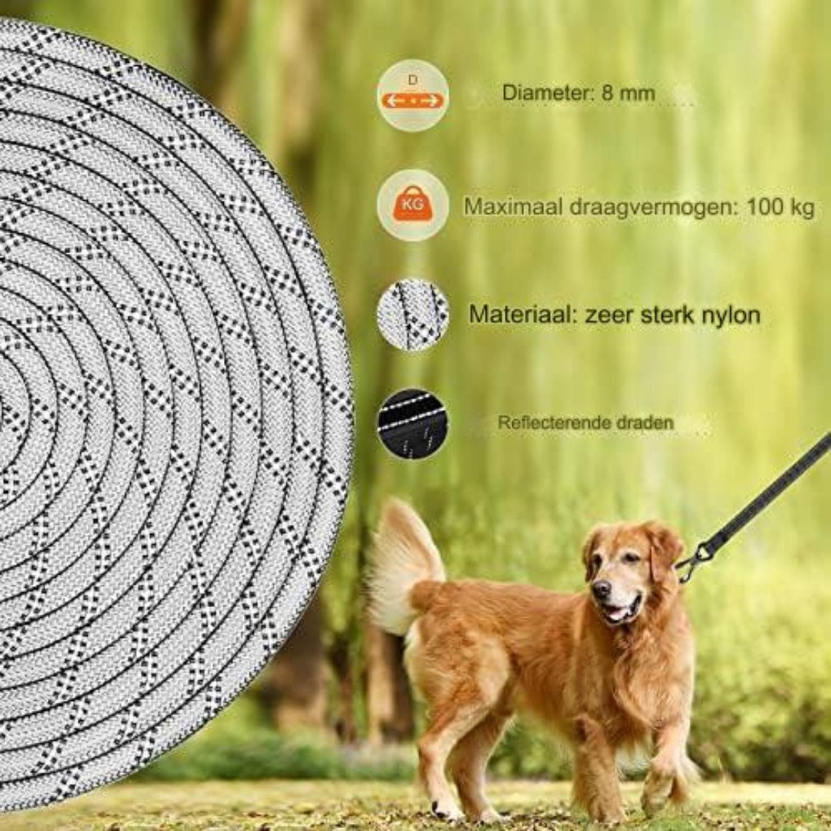 - Perfecte sleeplijn voor middelgrote en grote honden: Als u een middelgrote of grote hond heeft, heeft u een riem met goede schokdemping nodig om uw hond onder controle te houden, zonder uw gang aan te passen. Dankzij het bungeetouw, het zeer flexibele handvat en de afsluitbare haak is deze hondenriem perfect voor jou. Wij hebben 3m, 4,5m, 5m, 9m, 10m, 15m, 20m, 30m linnen naar keuze.