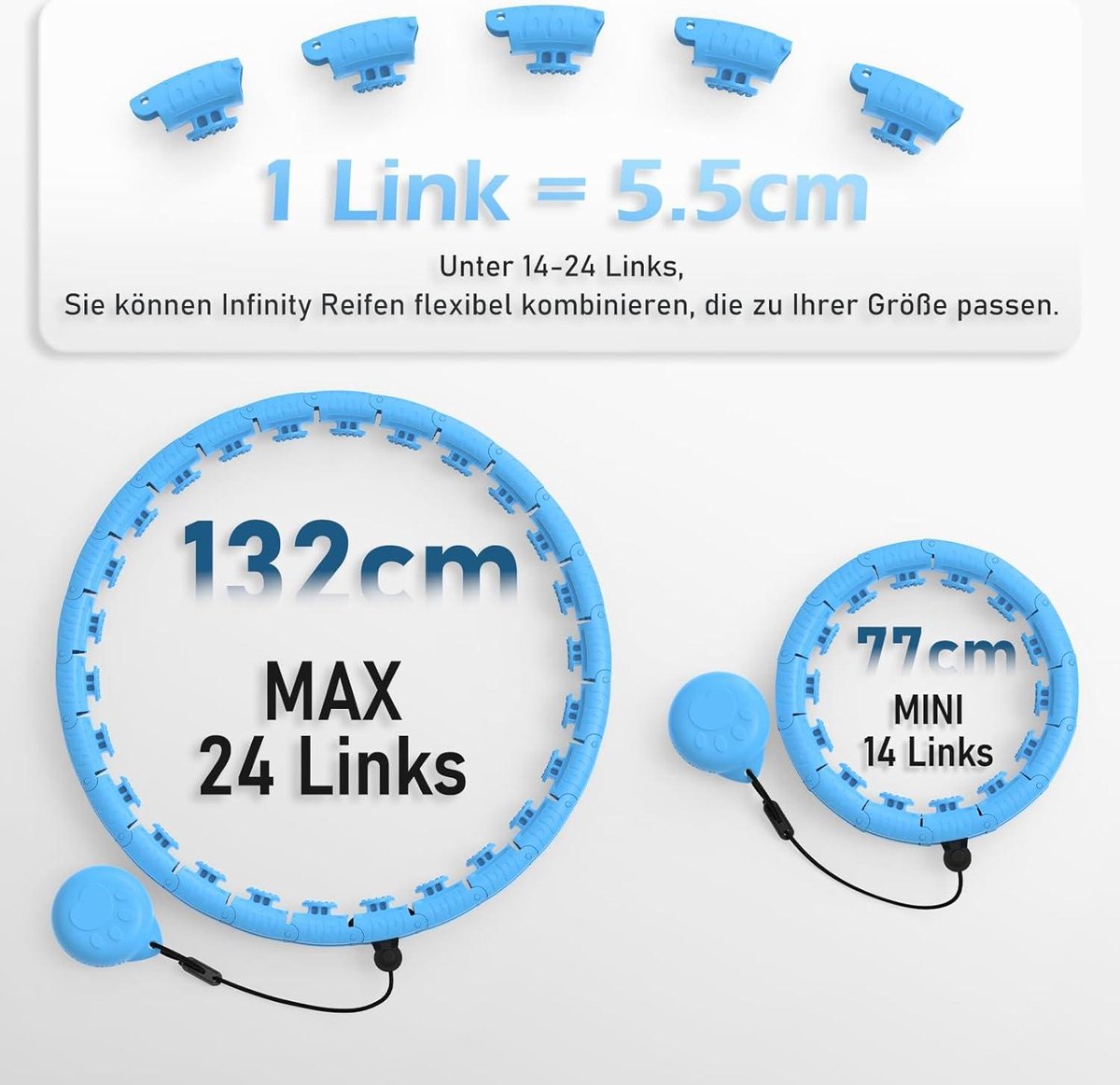 Onze oefenring bevat 24 afneembare schakels die geschikt zijn voor alle maten tussen 77cm/30 inch (14 schakels) en 132 cm/52 inch (24 schakels). U kunt het aantal schakels aanpassen aan uw maat en trainingsbehoeften. De ring is gemaakt van milieuvriendelijke ABS-materialen, waardoor deze sterk en duurzaam is.