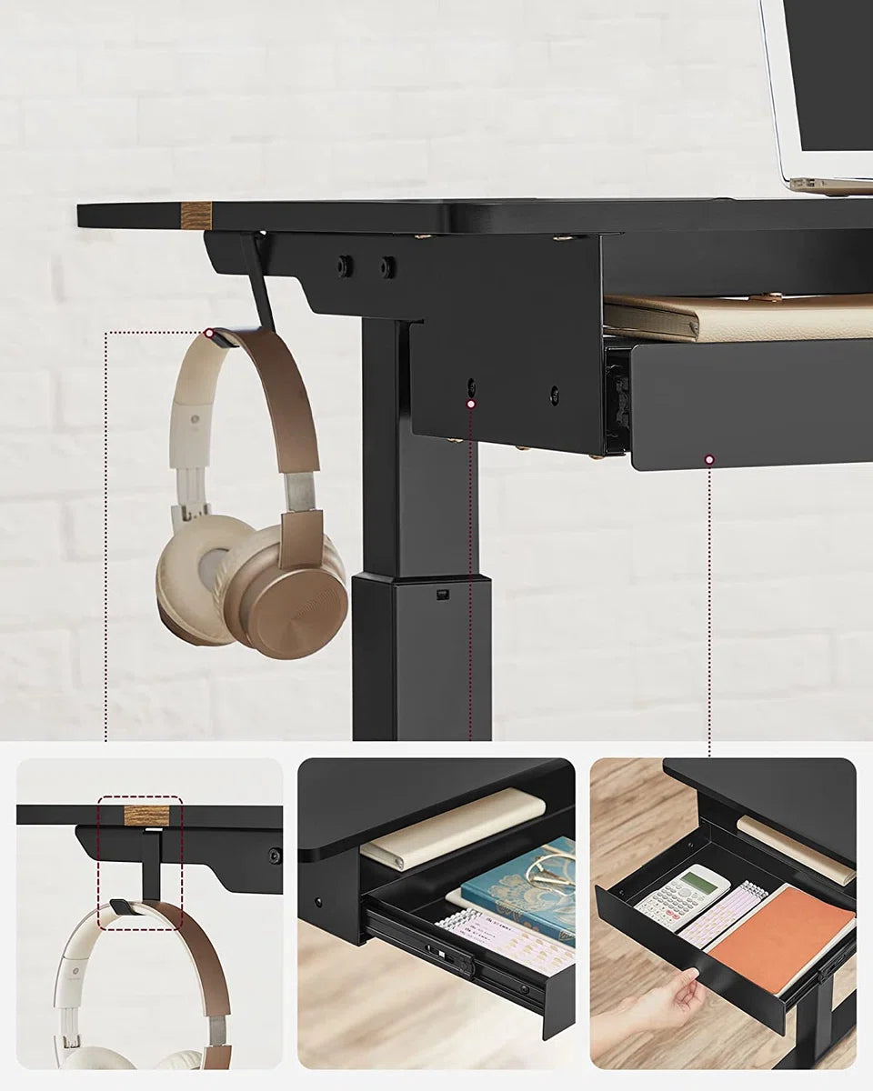 - [Lade & haak] Een kleine lade (22,7 x 32,5 x 4,0 cm) voor kantoorbenodigdheden, de bovenkant van de lade voor laptop of documenten; de haak aan de zijkant kan worden gebruikt om hoofdtelefoons aan op te hangen voor gemakkelijke toegang